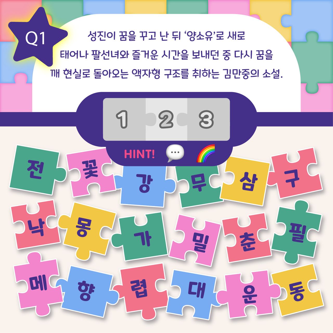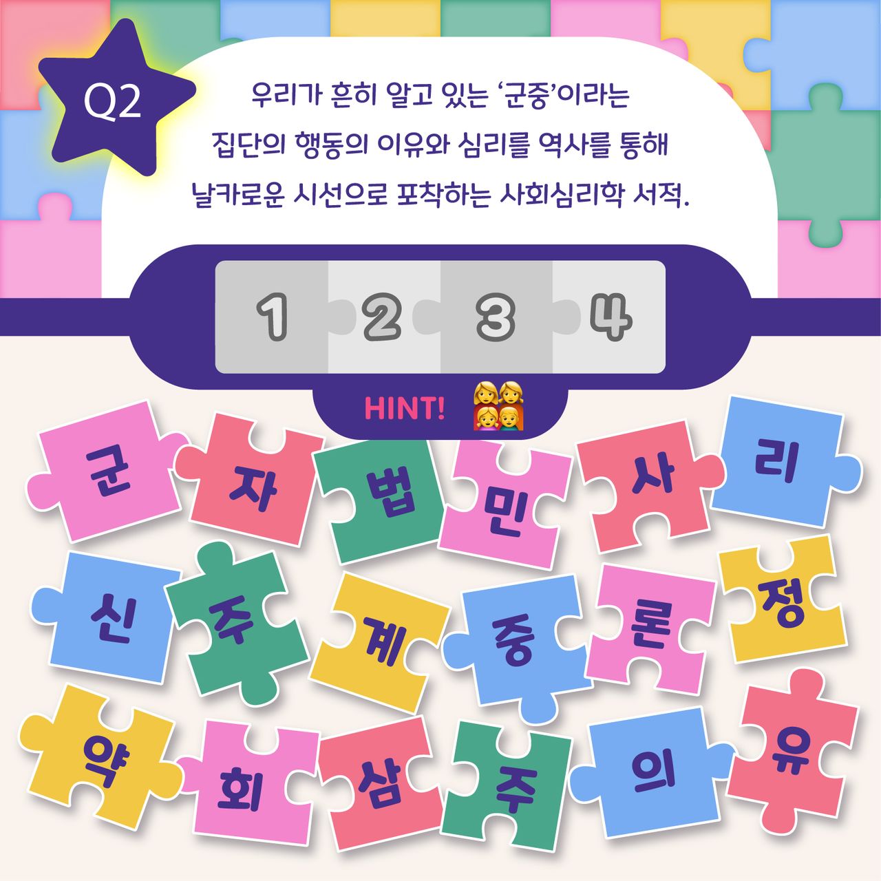 책 속 한줄 맞추기는 도서 속 문장의 배열을 맞춰보는 문장 퀴즈 콘텐츠입니다.시시각각 복잡다난하게 변화하는 세상 속에서 잠시 숨 고를 수 있는 시간이 되길 바랍니다. -정답을 확인해볼까요?...... ...