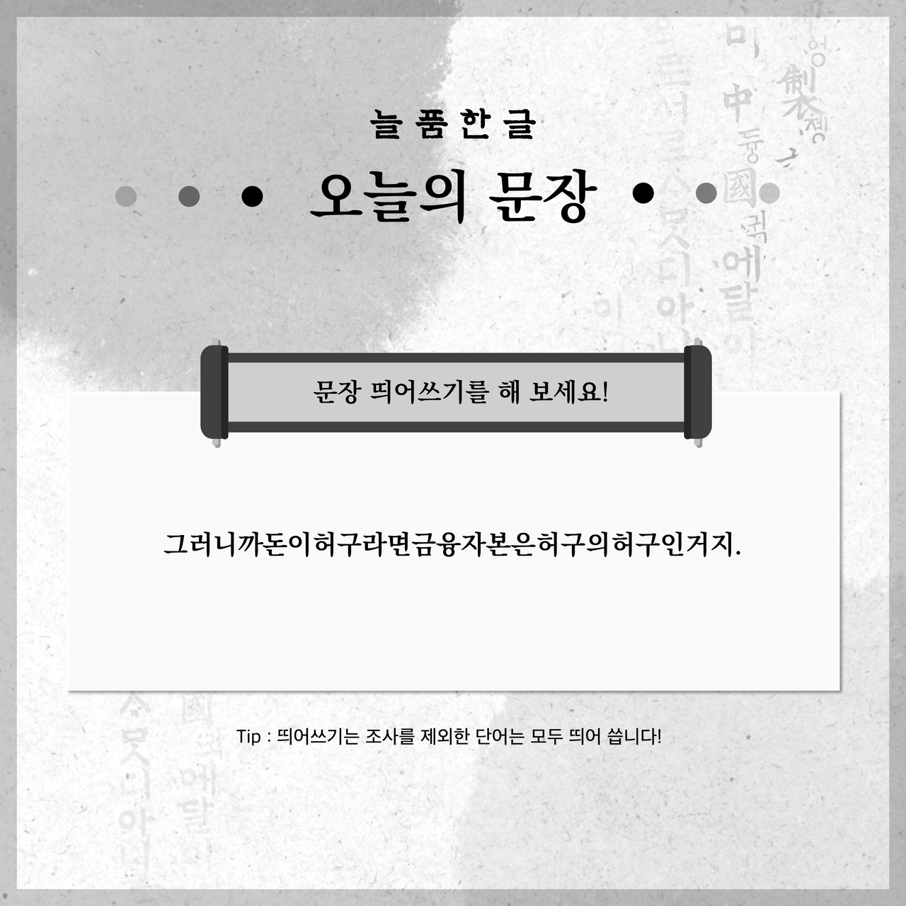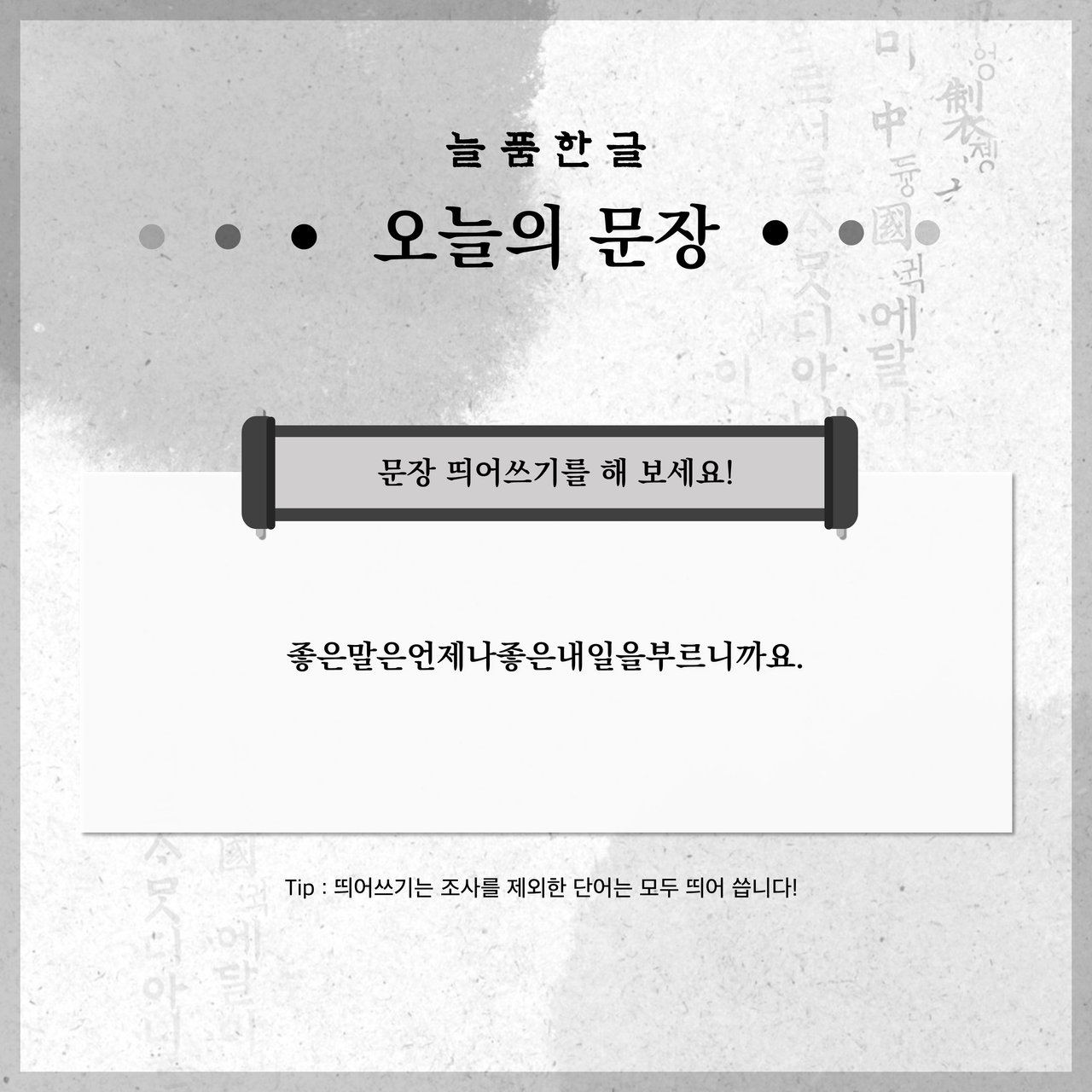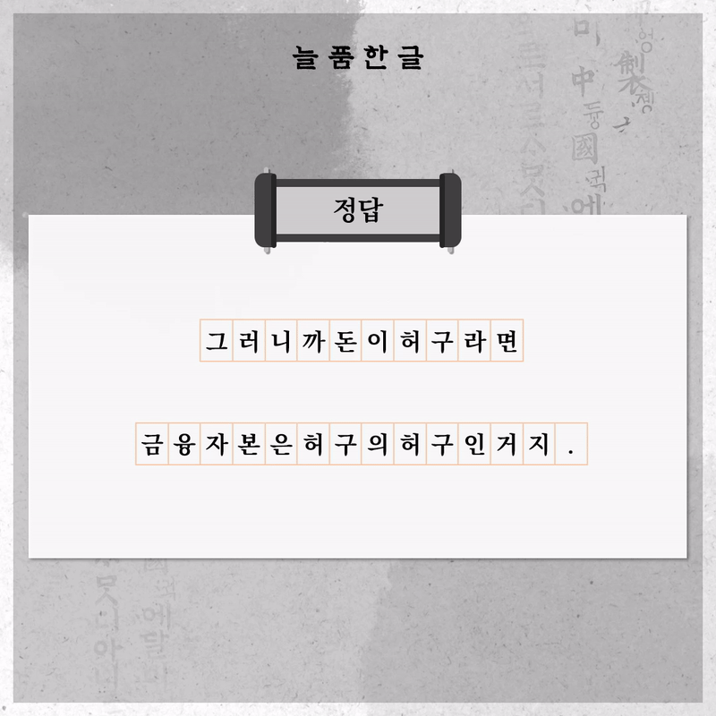 두근두근정답 확인~!... 여러분 정답 맞춰보셨나요?오늘의 늘품한글은 여기까지입니다. 마지막으로 문장들을 다시 한 번 살펴 보며 우리 다음에 또 만나요~!