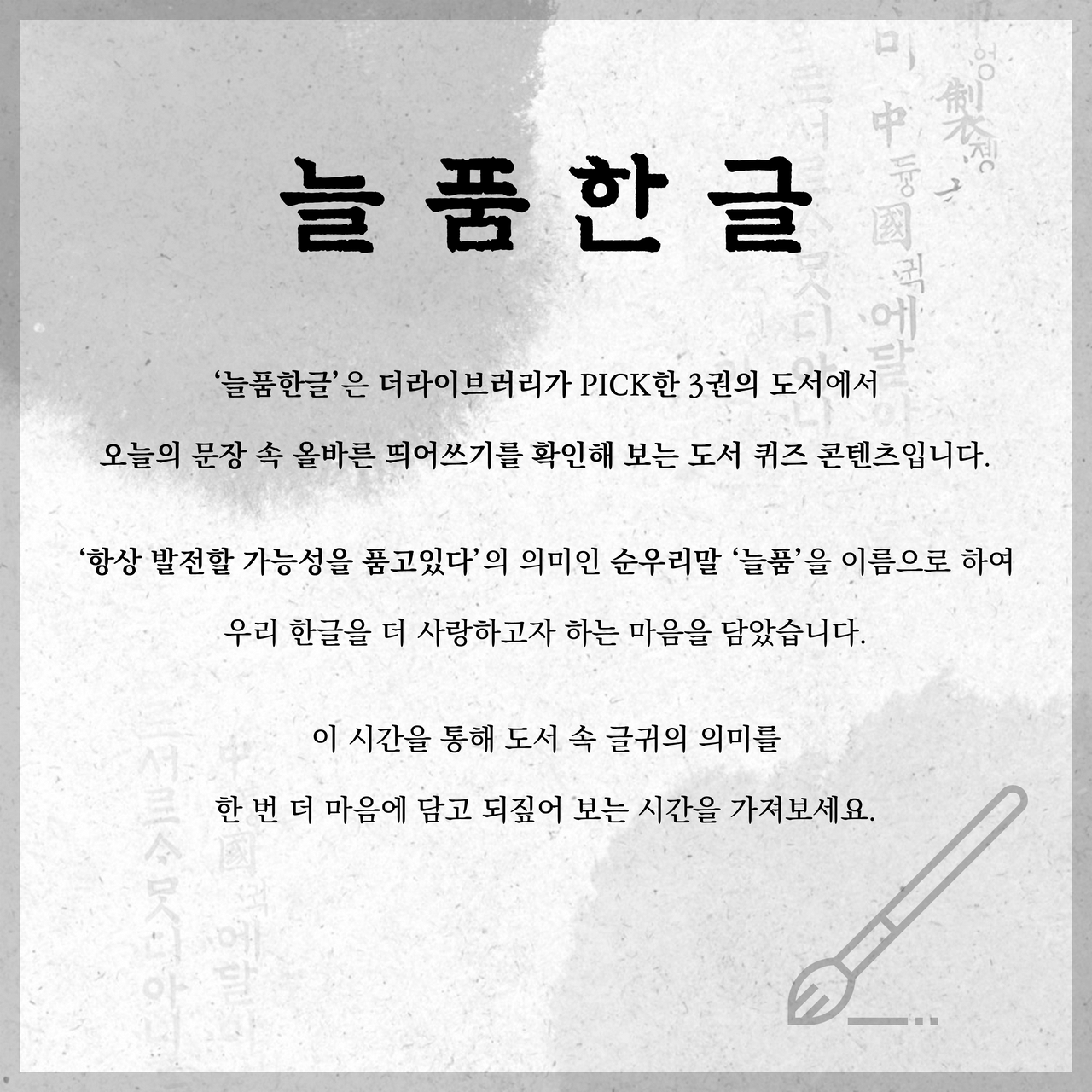더라이브러리가 기획 /제작한 독서 게임 퀴즈“이모지 게임”에 참여해보세요...! -이모지는 전자처리 그림문자 및 기술로흔히 일상 속에서 많이 사용하고 있습니다.해당 콘텐츠는 제시한 이모지들을 조합해 도서 제목을 유추해보는 독서 퀴즈 게임입니다.당신의 독서력과 연상 능력을 테스트해보고싶다면 지금 바로 Go! Go!