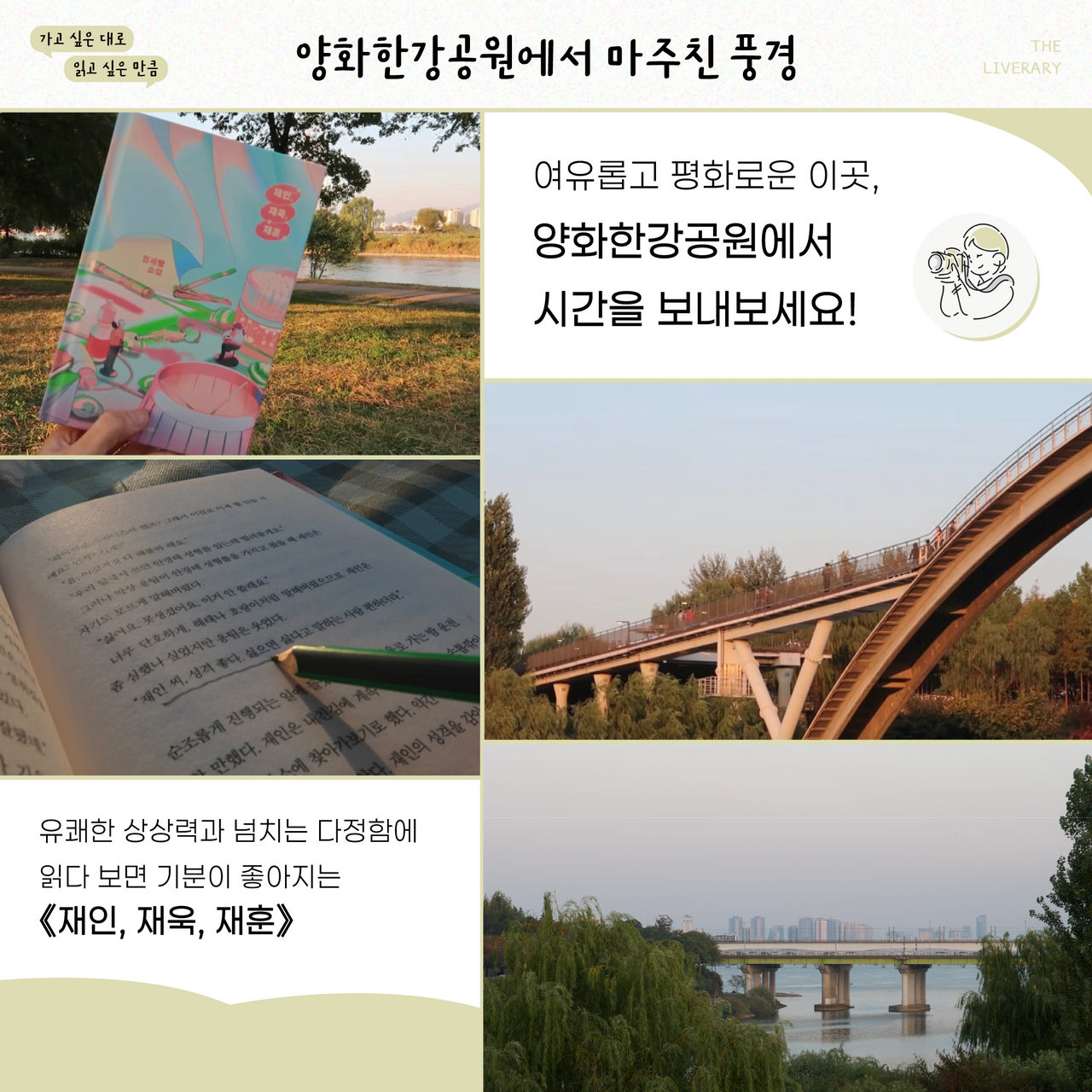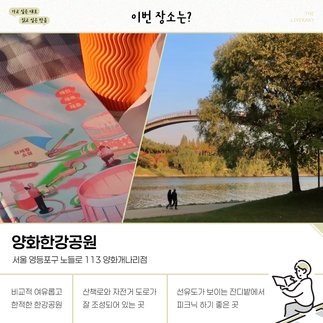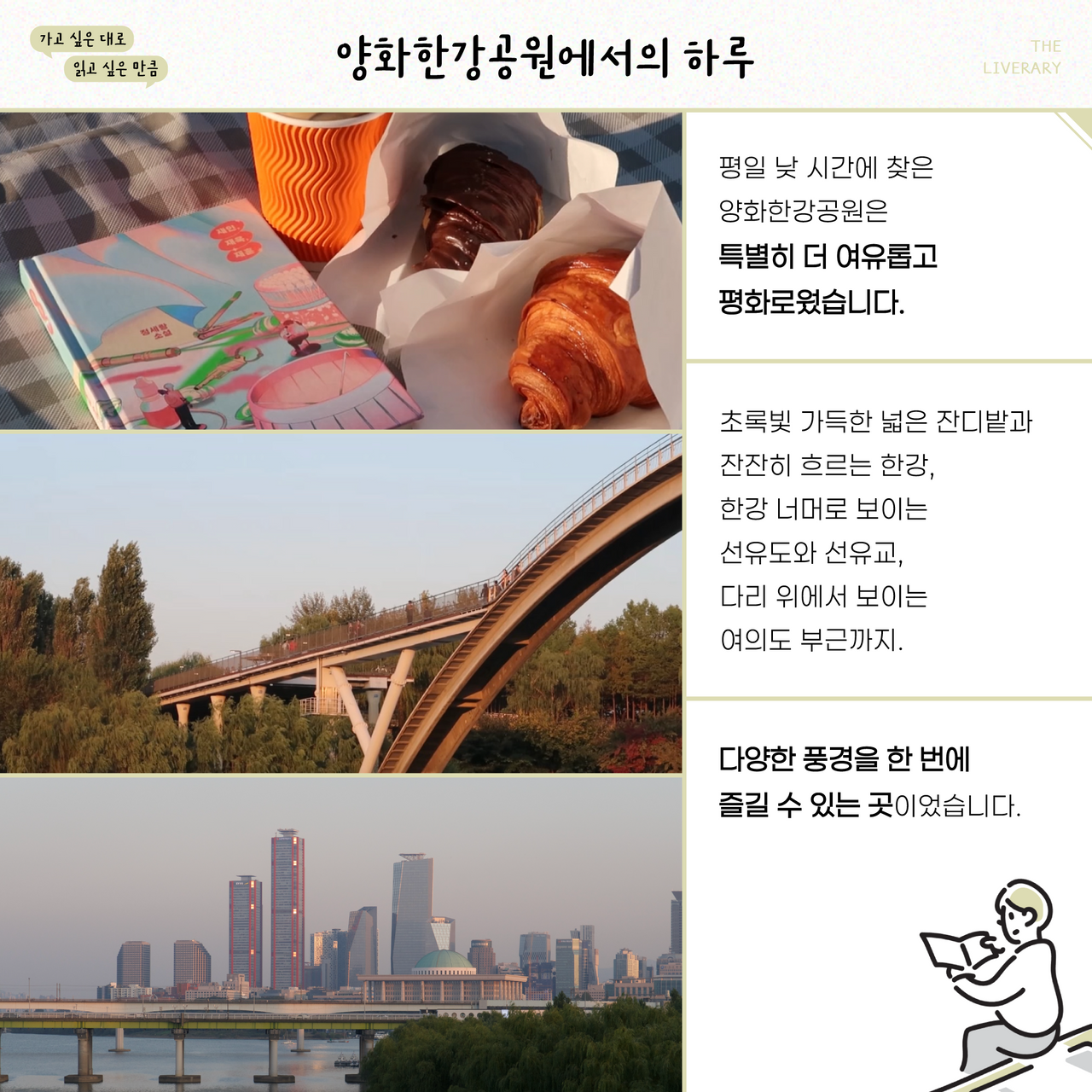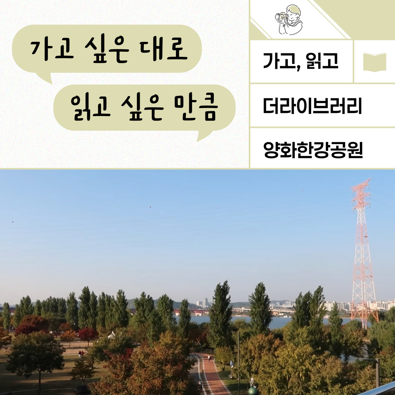 가고, 읽고는 '가고 싶은 대로, 읽고 싶은 만큼'의 줄임말로 평소에 가고 싶었던 특정 장소에 가서 읽고 싶었던 책을 읽는 과정을 일상 풍경으로 담아 소개하는 콘텐츠입니다. 이번에 다녀온 곳은 ‘노들섬’이었는데요, 노들섬에 가는 길부터 독서를 마치고 돌아오는 길까지 짧은 외출의 풍경을 영상과 이미지로 담아보았습니다. 함께 즐겨주세요!