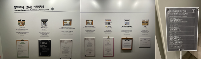 김치요리를 만드는 해외 식당을 선별해 전시한 벽 및 다큐멘터리 상영 순서표