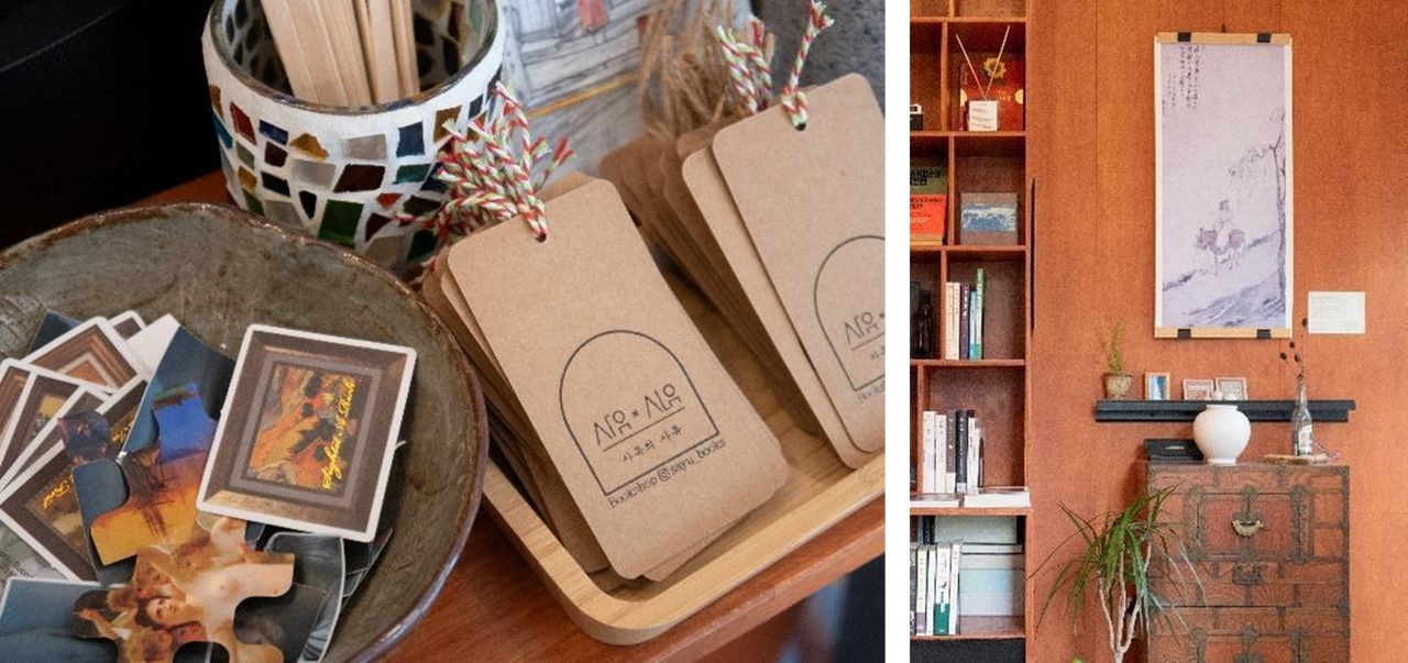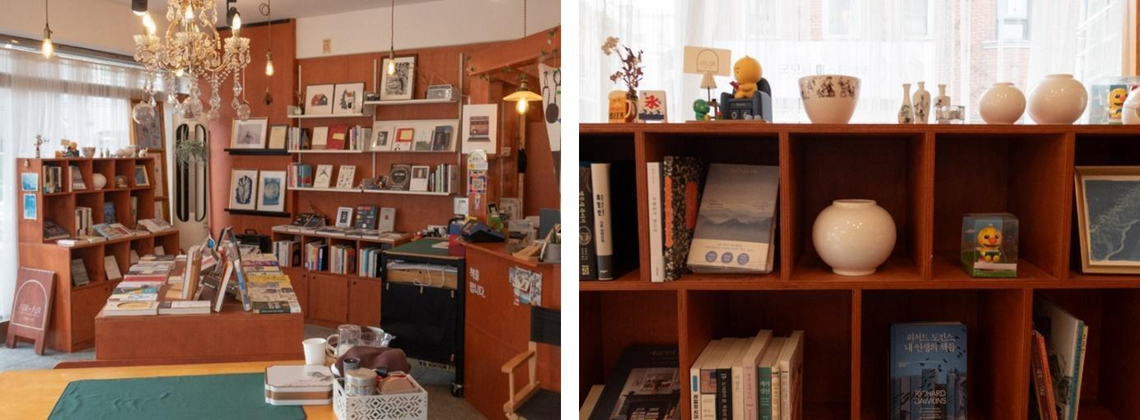 사유의 사유 내부 전경(좌) | 책장의 사이사이 놓인 소품들(우)