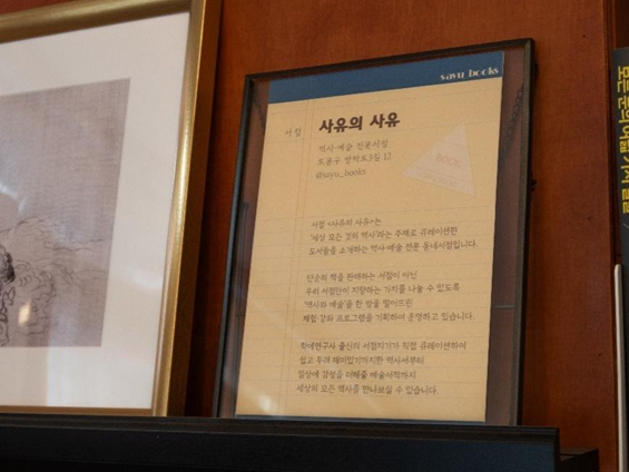 “서점 <사유의 사유>는 ‘세상 모든 것의 역사’라는 주제로 큐레이션 한 도서들을 소개하는 역사•예술 전문 동네서점입니다.“