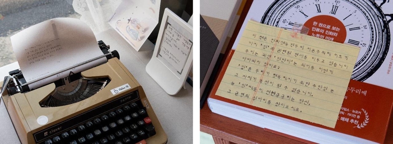 직접 체험해볼 수 있는 타자기(좌) | 타자기로 적은 사장님의 도서 코멘트(우)