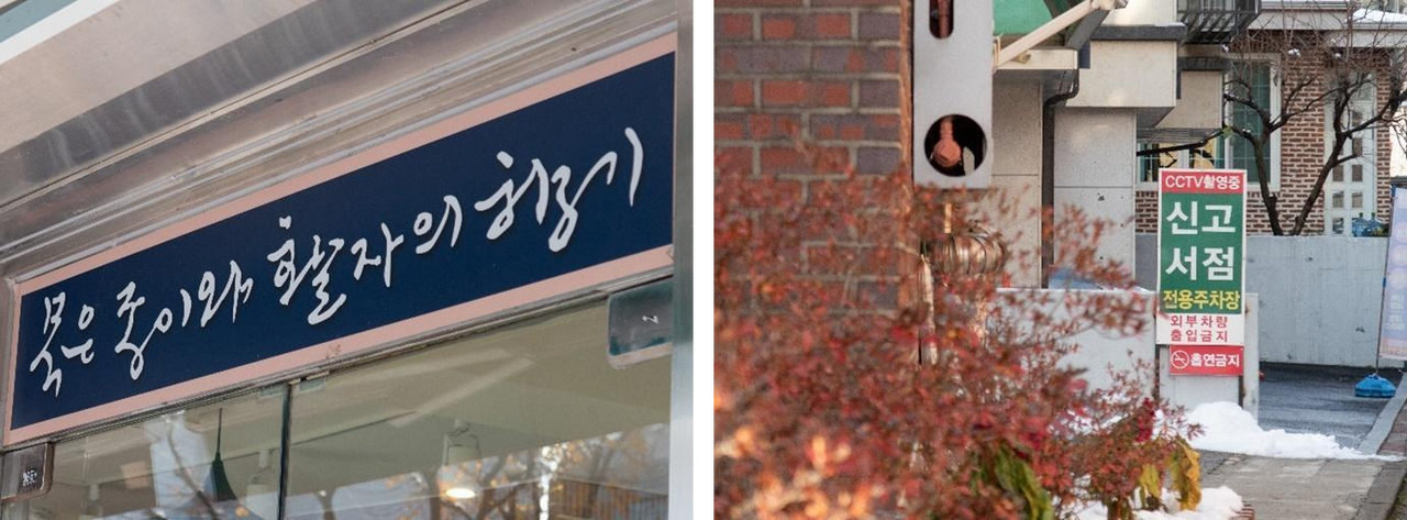 입구에 적힌 문구(좌) | 신고서점 주차장(우)