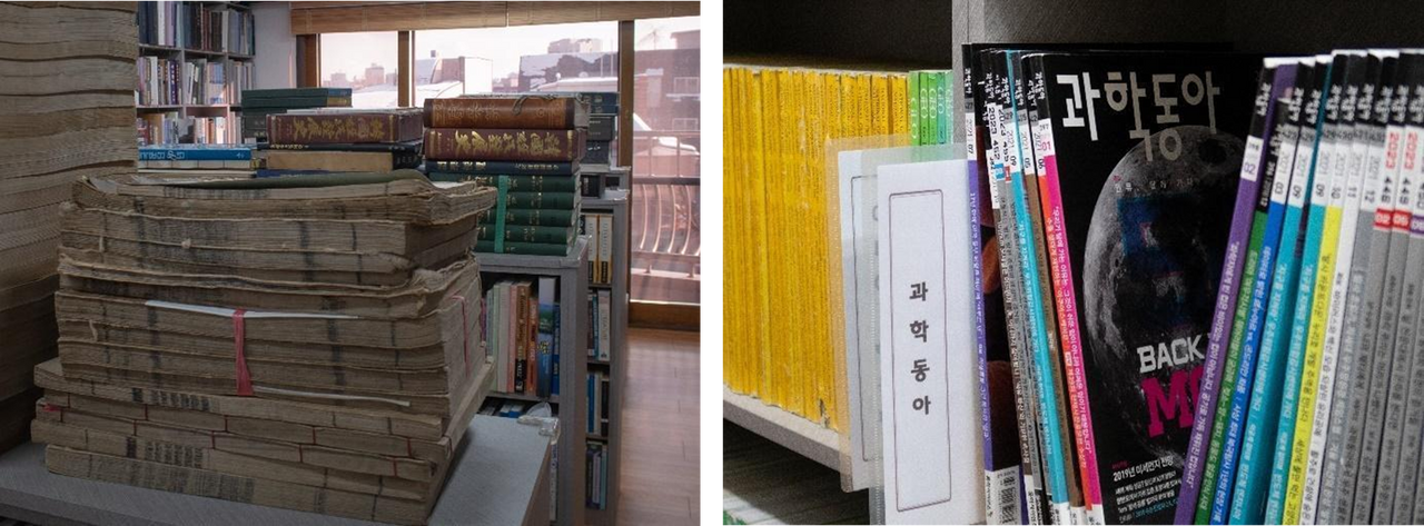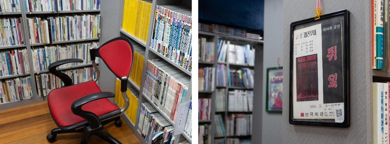 빛바랜 헌 책들 | 잡지 전권 세트 | 책장 사이 놓인 의자 | 옛 공연 포스터 소품들