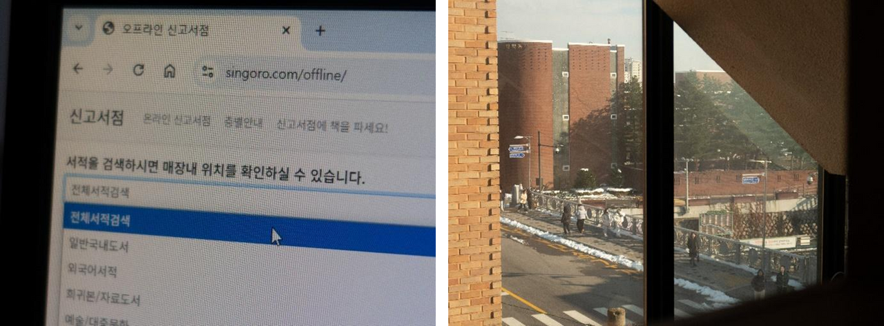 곳곳에 위치한 도서 검색 컴퓨터(좌) | 신고서점 계단에서 보이는 풍경(우)