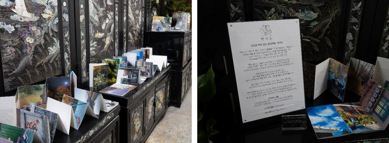 책방은 온통 검은색 자개장으로 가득합니다. 책방에 들어가는 문손잡이도 자개로 만들어져 있었고, 문을 열고 들어가자마자 자개로 만든 모빌이 달려 있었습니다. 이 모빌은 책방을 찾는 손님들이 자개에 쓴 방명록으로 만든 것이었는데, 방명록을 자개에 적는 것도, 그걸 모빌로 만든 것도 신선하게 느껴졌습니다.