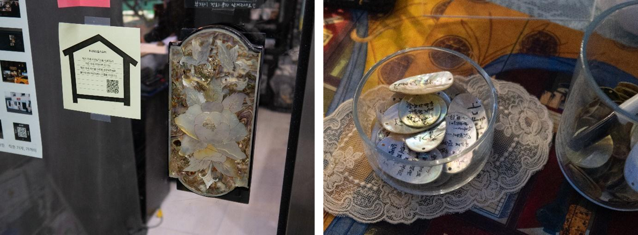 자개 문양 문손잡이(좌) | 자개에 적는방명록(우)