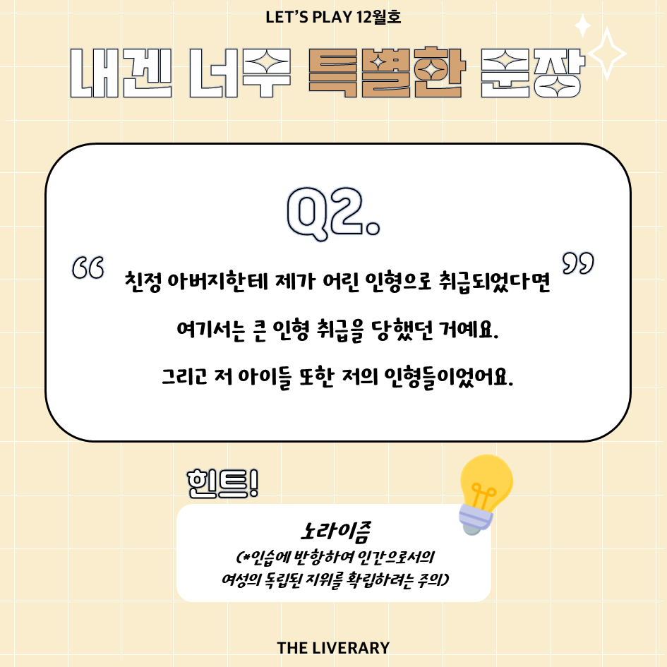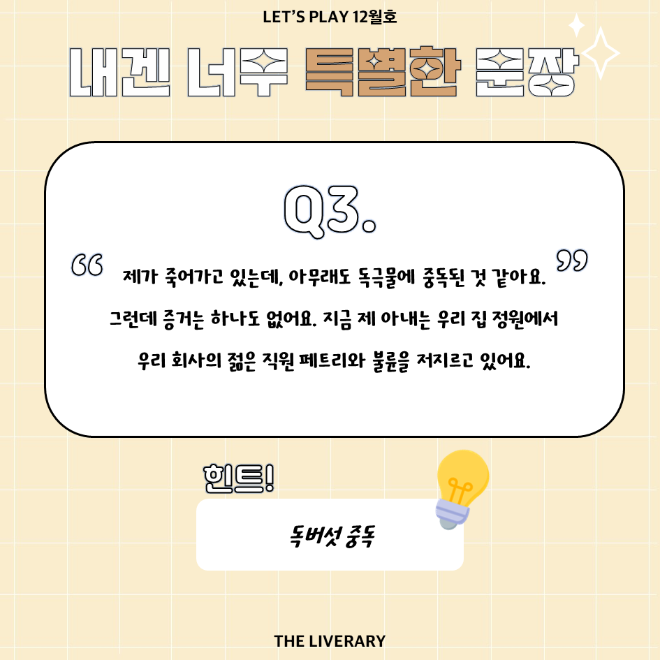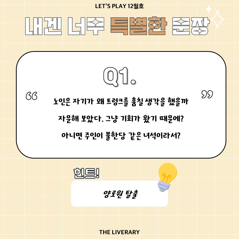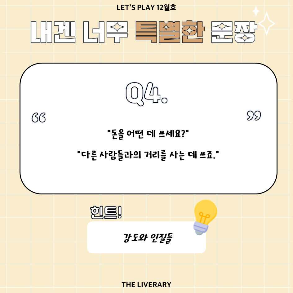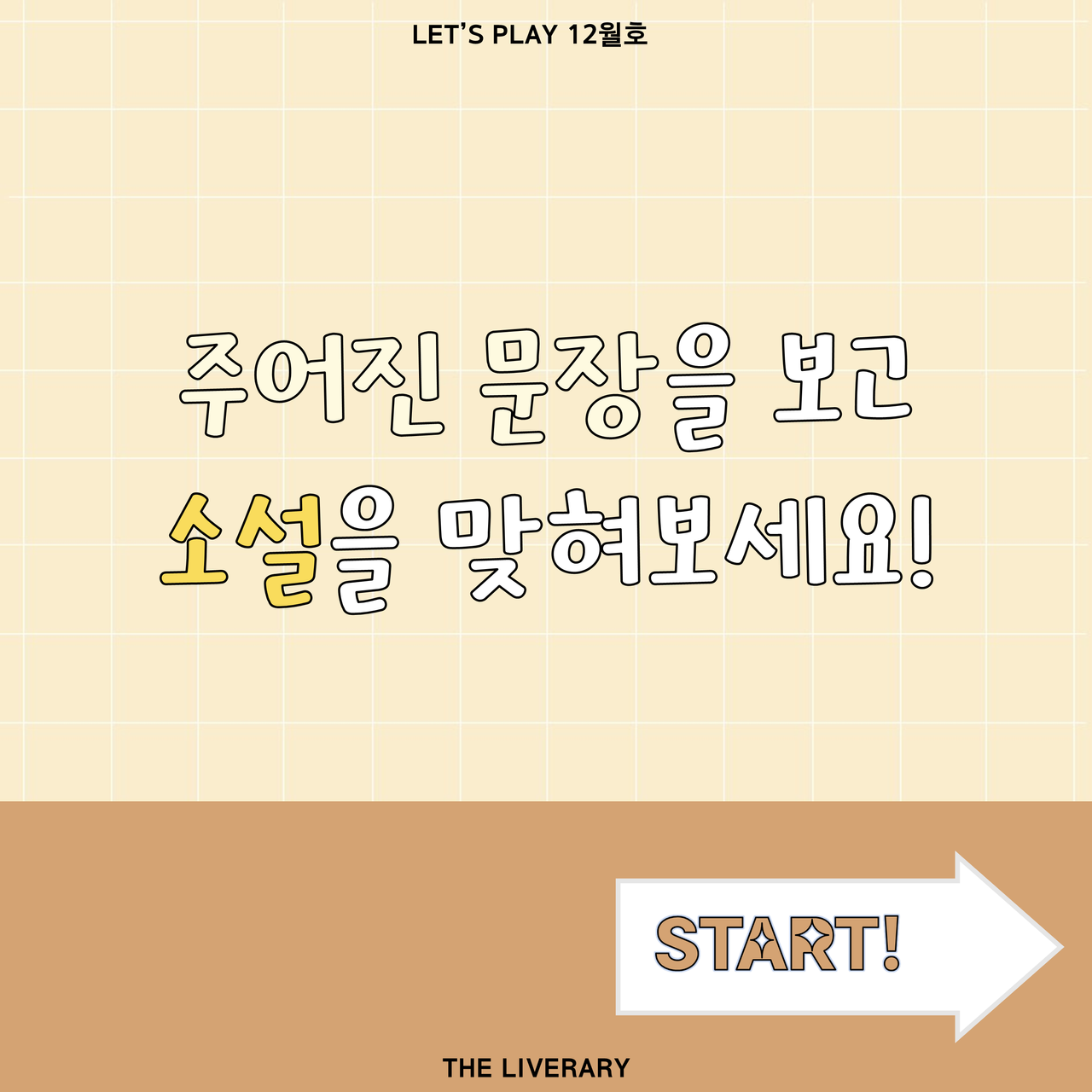 “Life is C between B and D”-장 폴 사르트르- 선택의 중요성에 대해 강조한위 말처럼 우리 삶은 선택의 연속인데요.진로를 선택하고, 직장을 선택하고사소하게는 점심 메뉴까지…!일상 속에서의 모든 것이 실은 선택의 연속입니다.하지만 피할 수 없으면 즐기라고 했던가요?!흥미로운 밸런스 게임을 통해미처 알아채지 못했던나의 독서 취향을 알아보