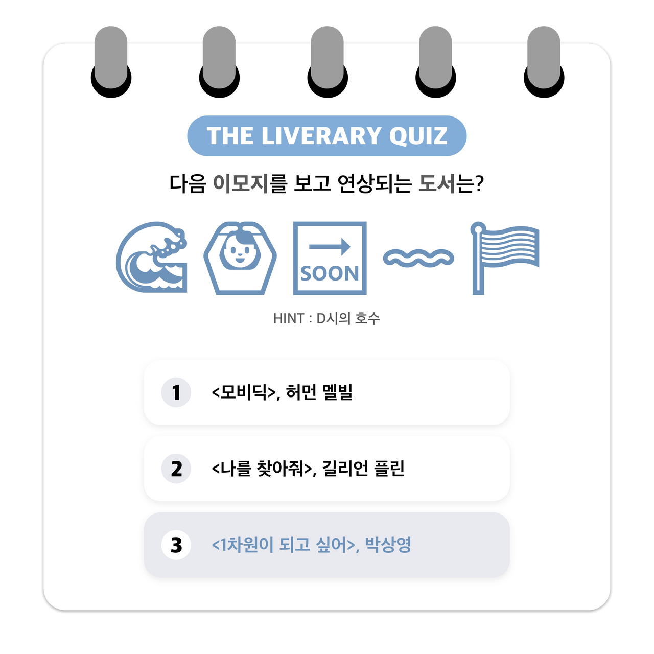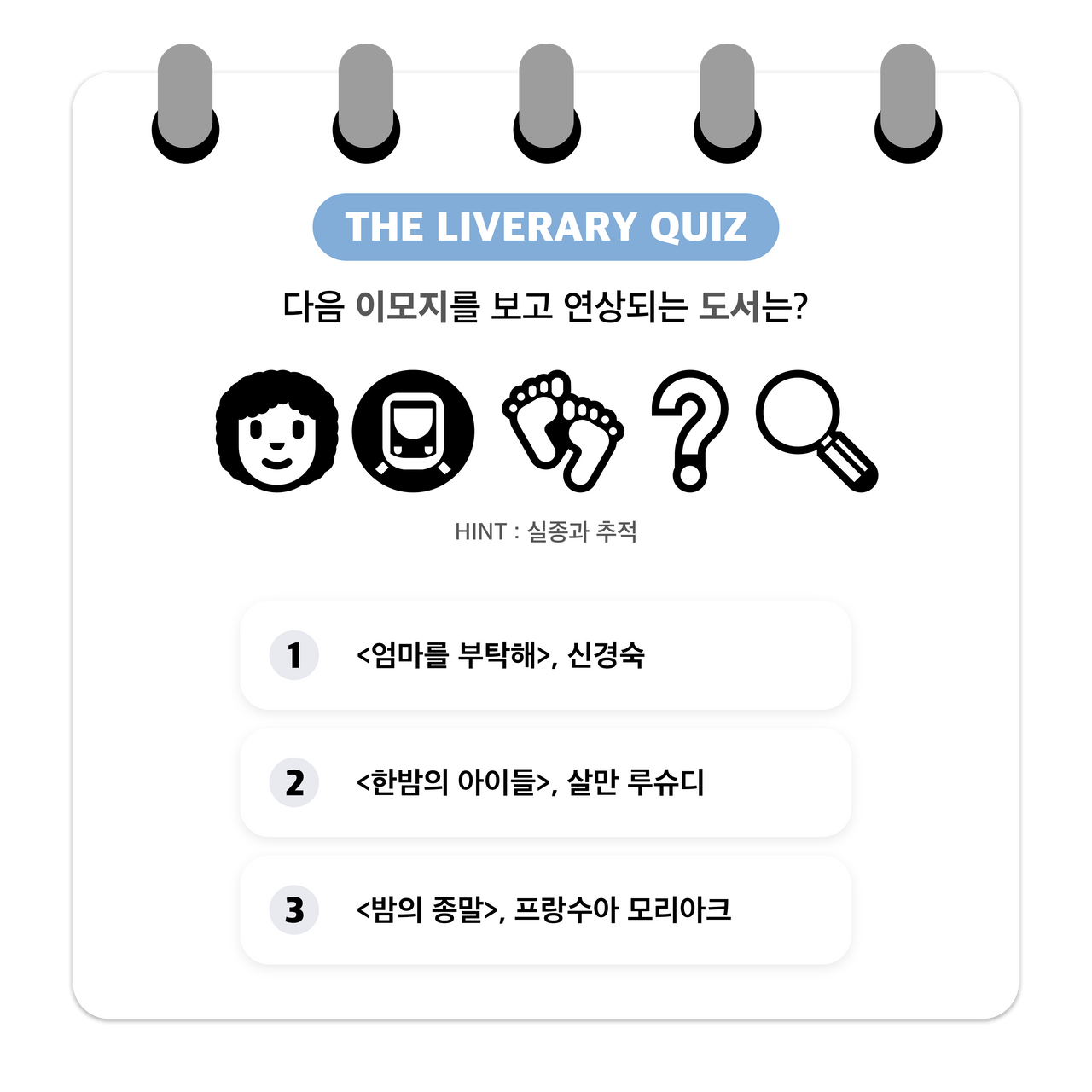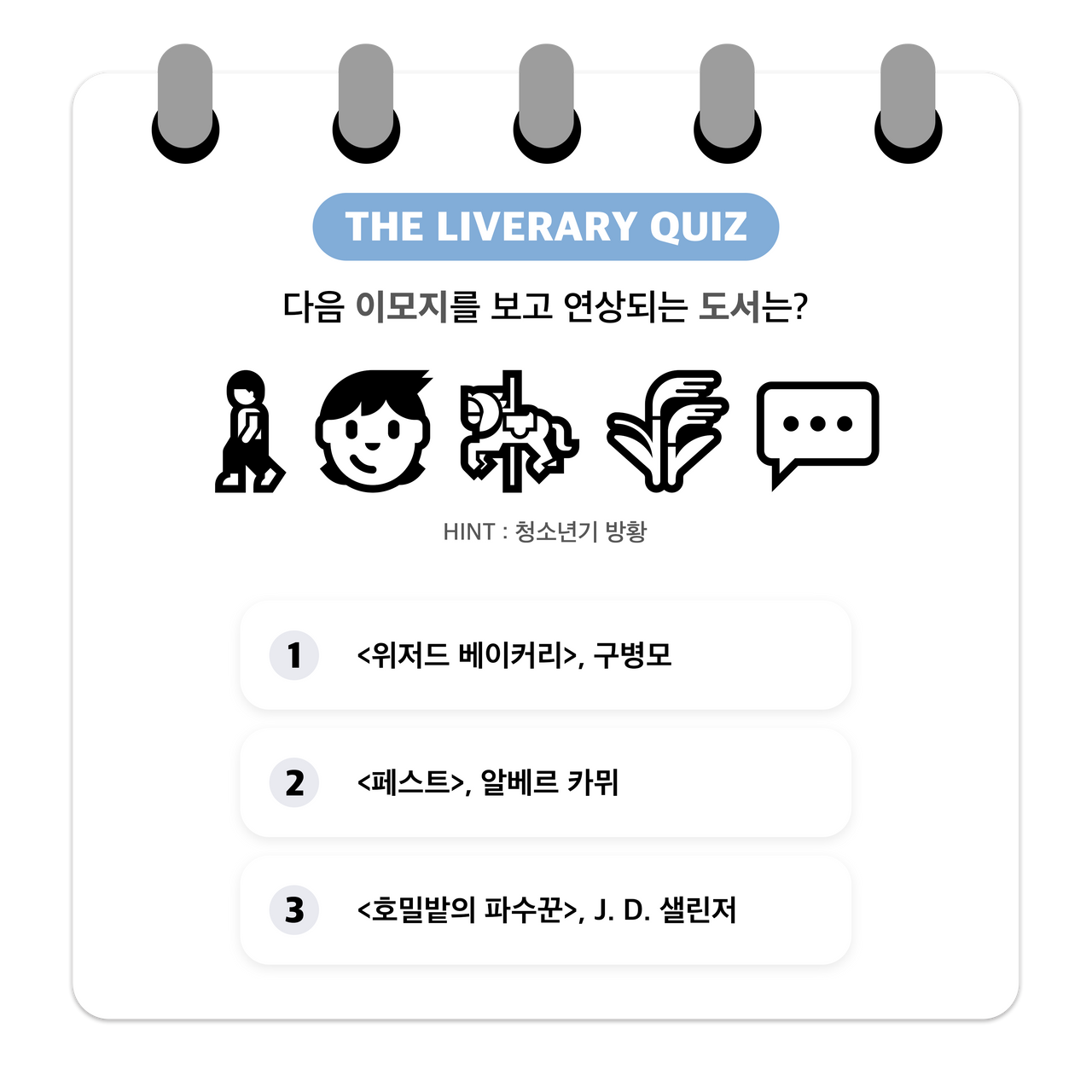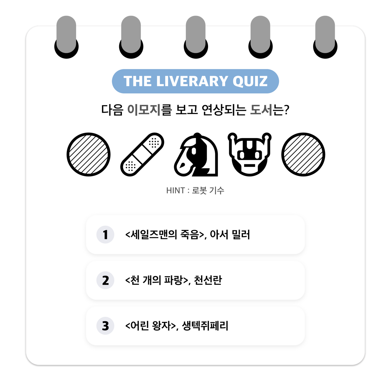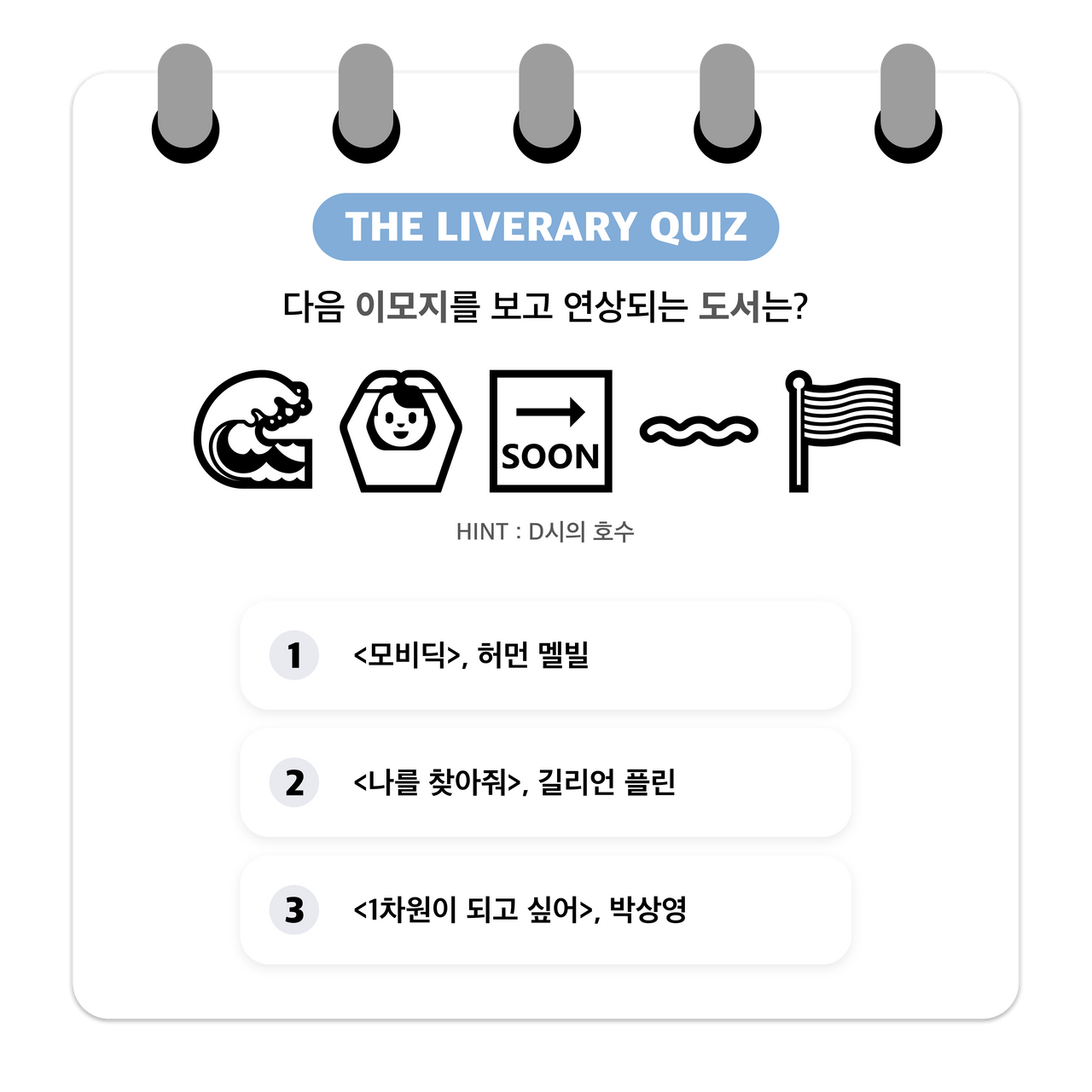 더라이브러리가 기획 /제작한 독서 게임 퀴즈“이모지 게임”에 참여해보세요...! -이모지는 전자처리 그림문자 및 기술로흔히 일상 속에서 많이 사용하고 있습니다.해당 콘텐츠는 제시한 이모지들을 조합해 도서 제목을 유추해보는 독서 퀴즈 게임입니다.당신의 독서력과 연상 능력을 테스트해보고싶다면 지금 바로 Go! Go!