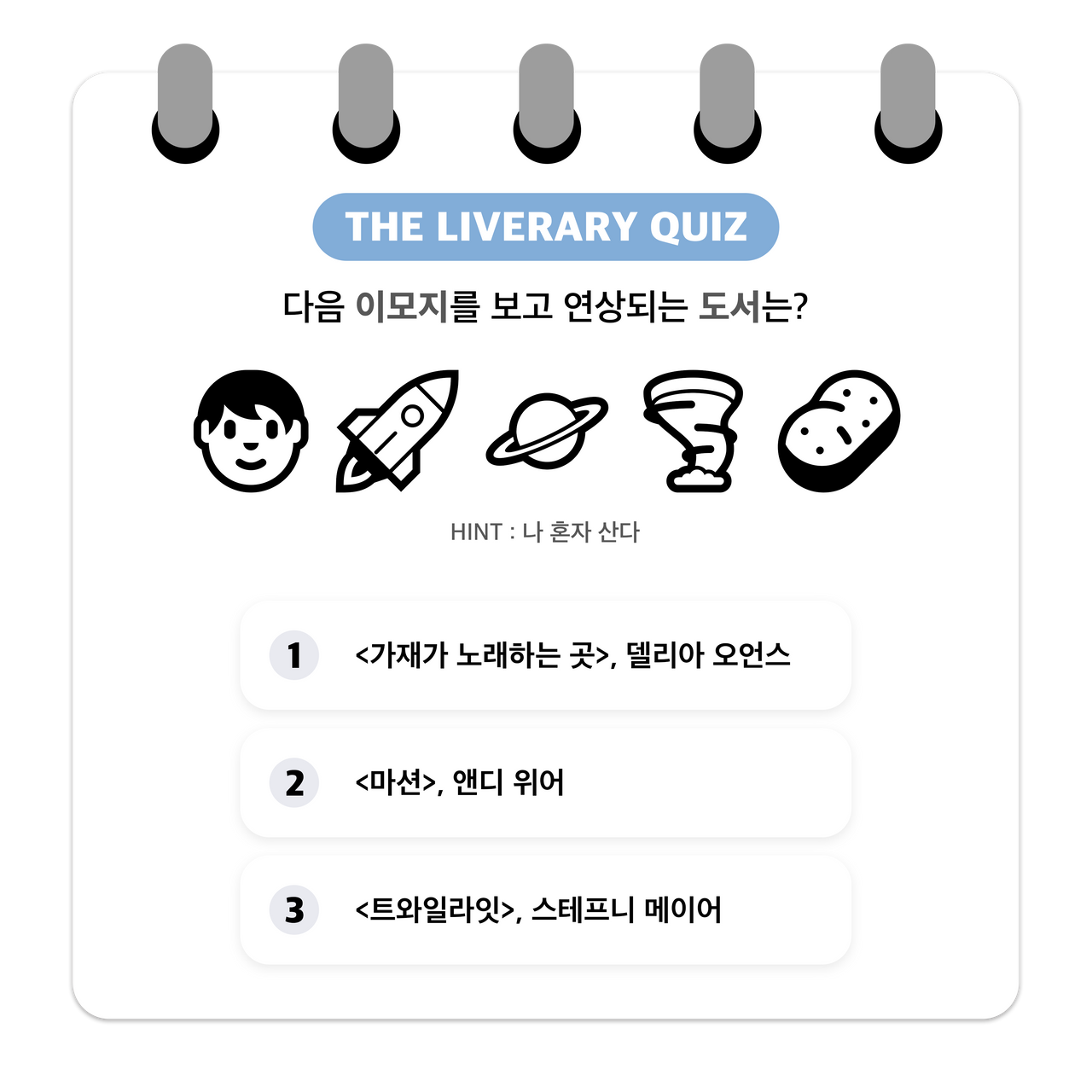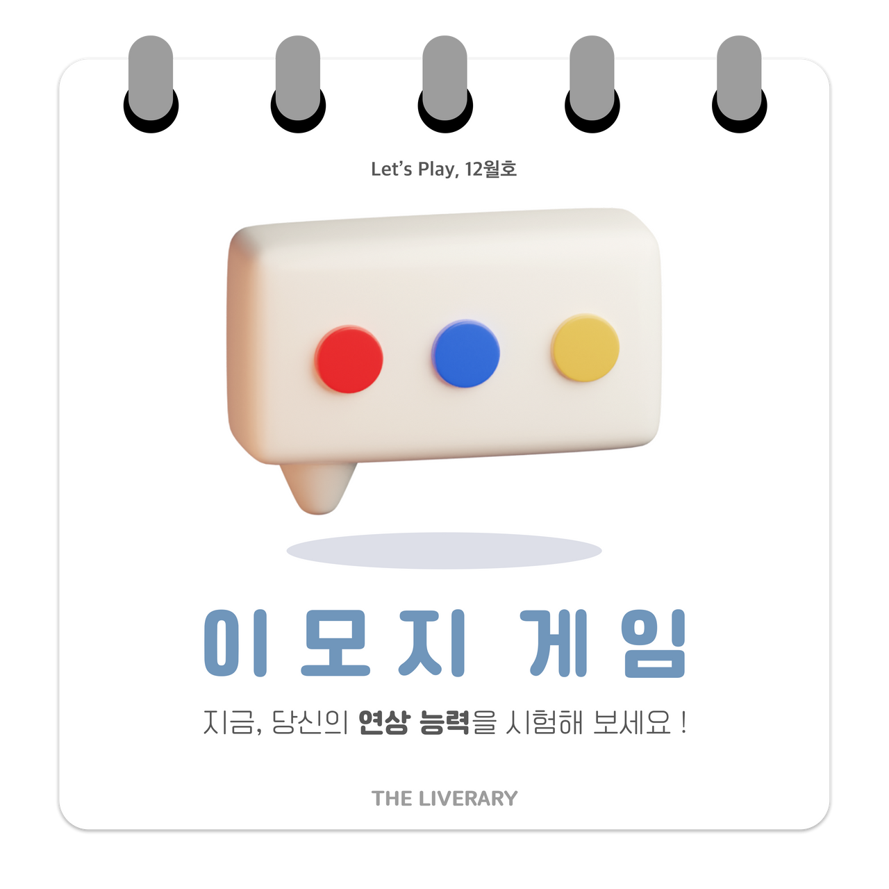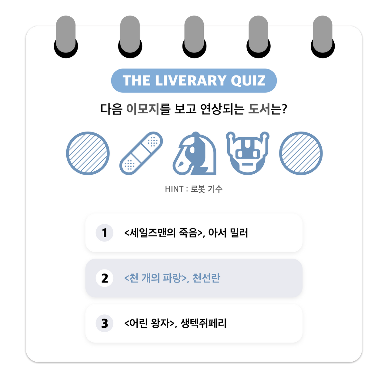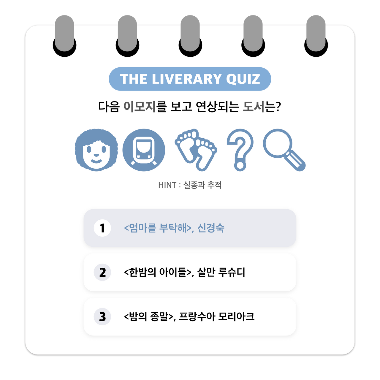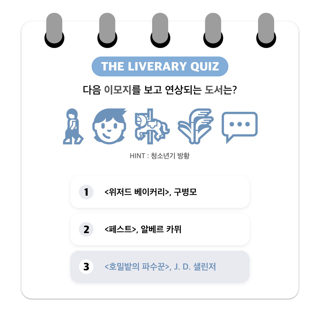 더라이브러리가 기획 /제작한 독서 게임 퀴즈“이모지 게임”에 참여해보세요...! -이모지는 전자처리 그림문자 및 기술로흔히 일상 속에서 많이 사용하고 있습니다.해당 콘텐츠는 제시한 이모지들을 조합해 도서 제목을 유추해보는 독서 퀴즈 게임입니다.당신의 독서력과 연상 능력을 테스트해보고싶다면 지금 바로 Go! Go!