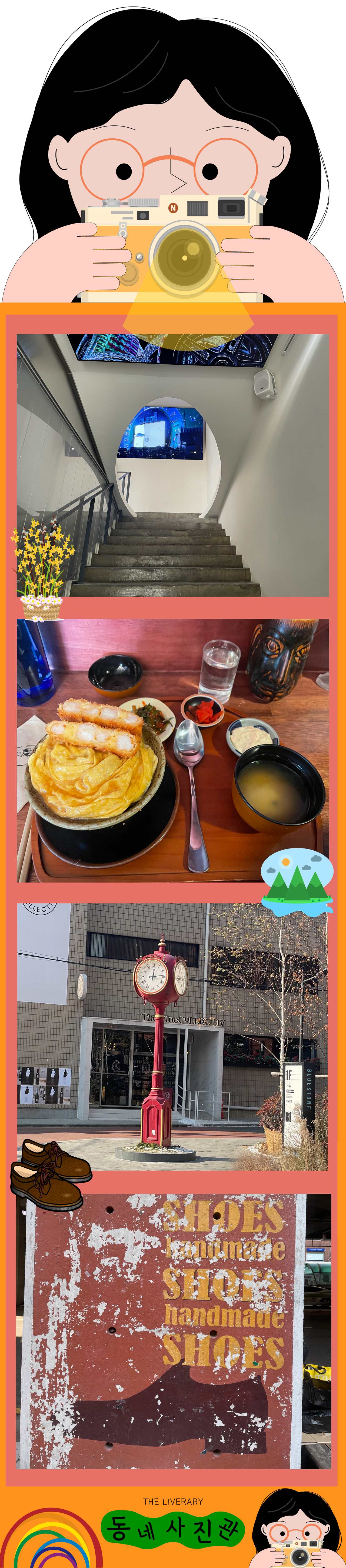 “동네사진관”은 여행 사진을 4컷으로 요약하여 함께 추억과 일상을 공유하는 콘텐츠 서비스 입니다. 전문가가 찍은 우수한 사진이 아니어도 괜찮아요. 그날의 여러분이 직접 담은 사진을 추억과 함께 공유해보세요~금손이어도 꽝손이어도 오히려 좋아~ ♪♬그 날의 분위기를 공유하는데는 순간을 담은