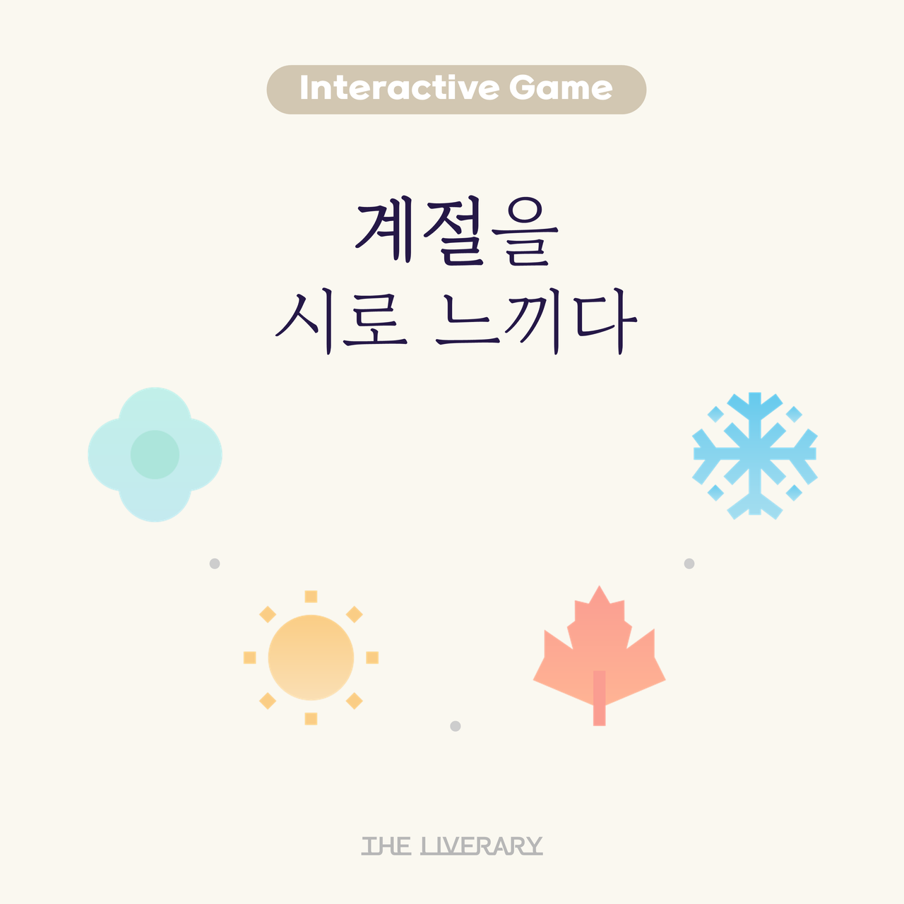 우리나라는 사계절이 뚜렷한 특징을 가지고 있죠! 계절마다 사람들이 느끼는 감상은 각각 다를 수 있는데요.마음에 드는 계절별 키워드를 선택해 취향에 맞는 시집 추천 받으세요!영상과 함께 시 한 구절 또한 감상할 수 있어요. 시를 즐길 준비 됐다면 지금 바로▲▲▲ “계절을 시로 느끼다” 도