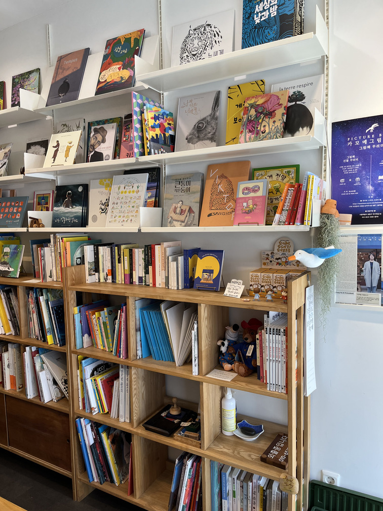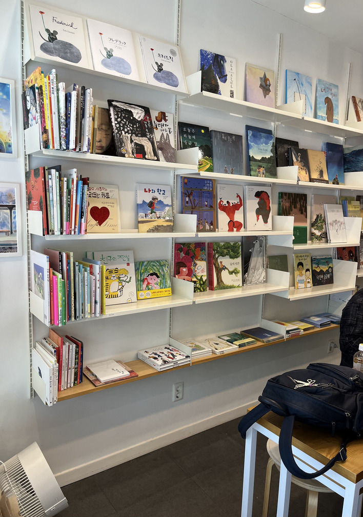 책장의 구분은 다양한 키워드로 이루어져 있었는데요. 웃음, 일본, 신간, 사회, 가족, 시 등 - 다양한 큐레이션으로 진열된 동화책을 구매할 수 있습니다. Jane이 방문했던 동안에는 선생님, 작가님, 동화책을 사랑하는 어른 손님이 책방을 찾았습니다.