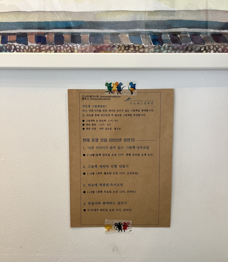 즐길 수 있는 시기가 지나쳤다 여기고 그림책과 어색해진 독자분들이 있다면, 금호동의 카모메 그림책방을 추천합니다. 책방지기님과 타로를 통해 내면을 들여다보고, 느리게 읽으며 풍족해지는 그림책의 매력을 발견할 수 있어요! 보다 자세한 운영시간은 사진을 참고해 주세요.