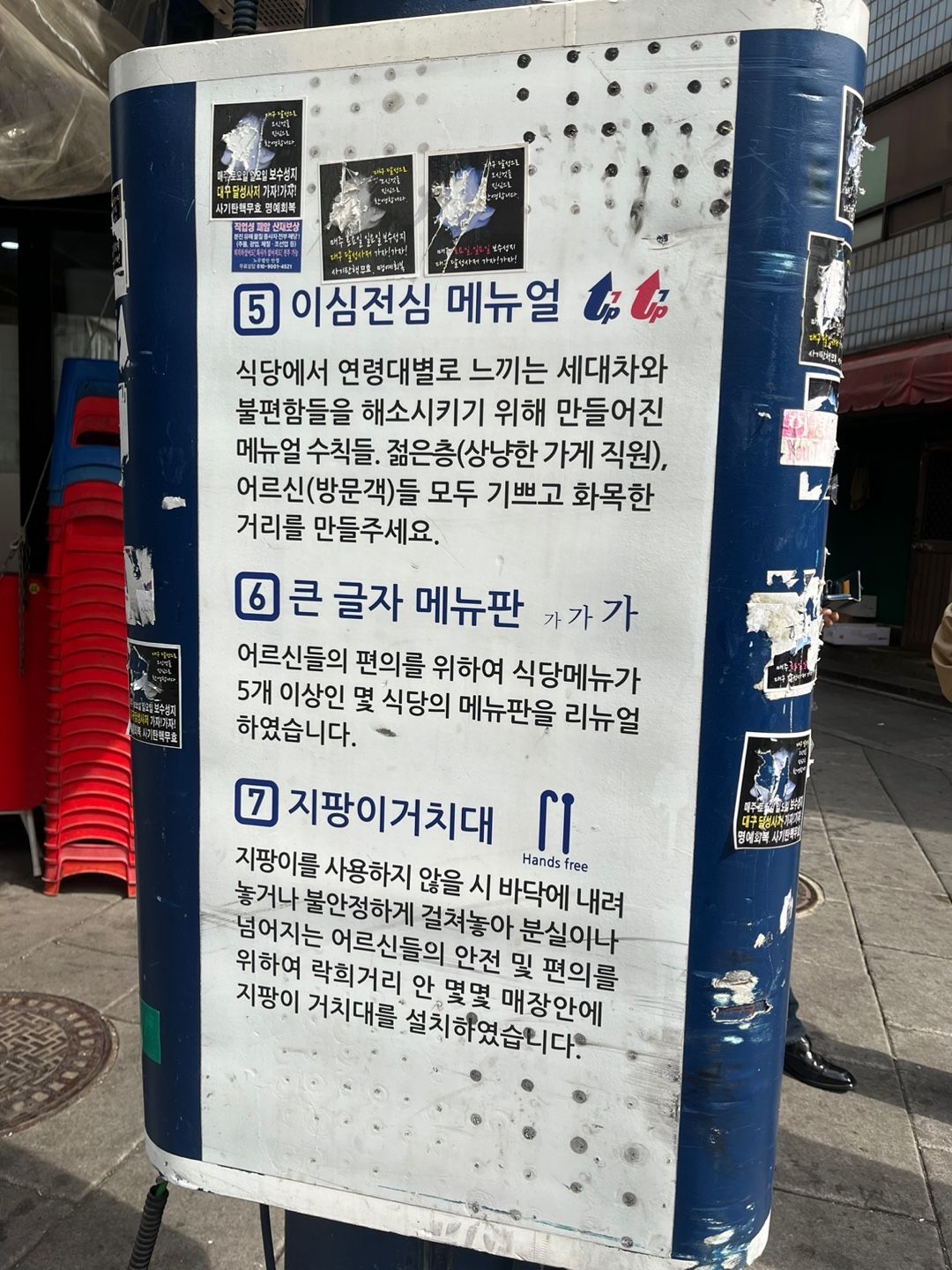 어르신들을 위한 편의 맞춤 화장실이 존재하고, 식당의 메뉴판은 큰 글씨로 만들었습니다.