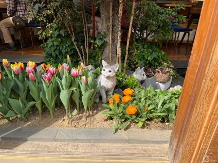 한 카페에는 이렇게 꽃과 고양이가 있었는데 너무 귀여워서 한참을 쳐다보았답니다. 고양이는 진짜라고 착각할 뻔했지만 인형이었습니다.