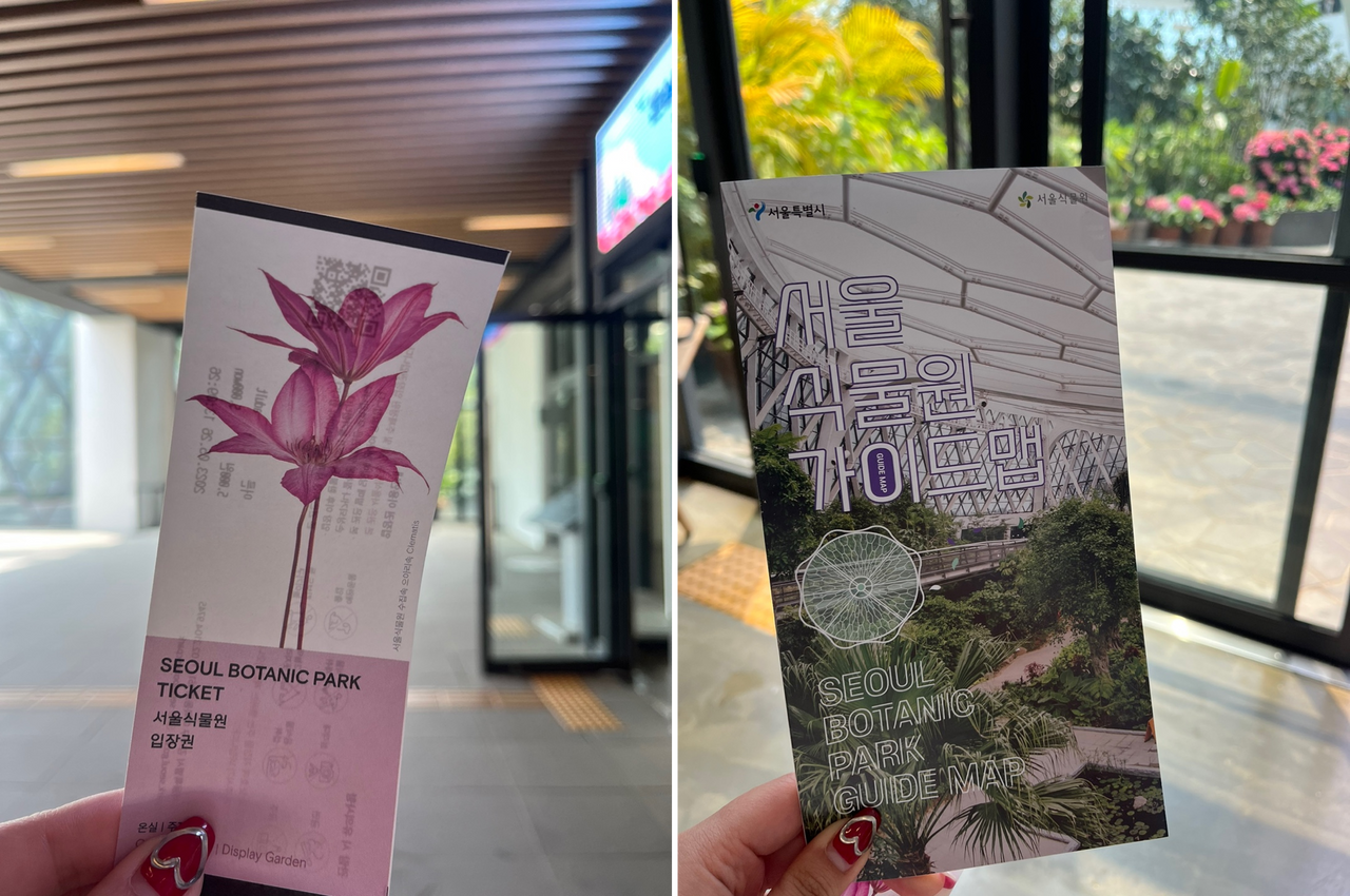 키오스크에서 입장권을 구매하면 사진과 같이 꽃이 그려진 입장권이 나옵니다. 이 입장권 뒤의 QR코드를 스캔하면 바로 입장할 수 있습니다. 저는 온실 앞에 비치된 가이드맵을 가지고 온실로 들어갔습니다. 온실은 지하 1층부터 지상 1층까지 이루어져 있습니다. 지하 1층엔 열대관과 지중해관이 있고, 지상 1층에는 스카이워크가 있어서 높은 곳에서 식물을 볼 수 있습니다.