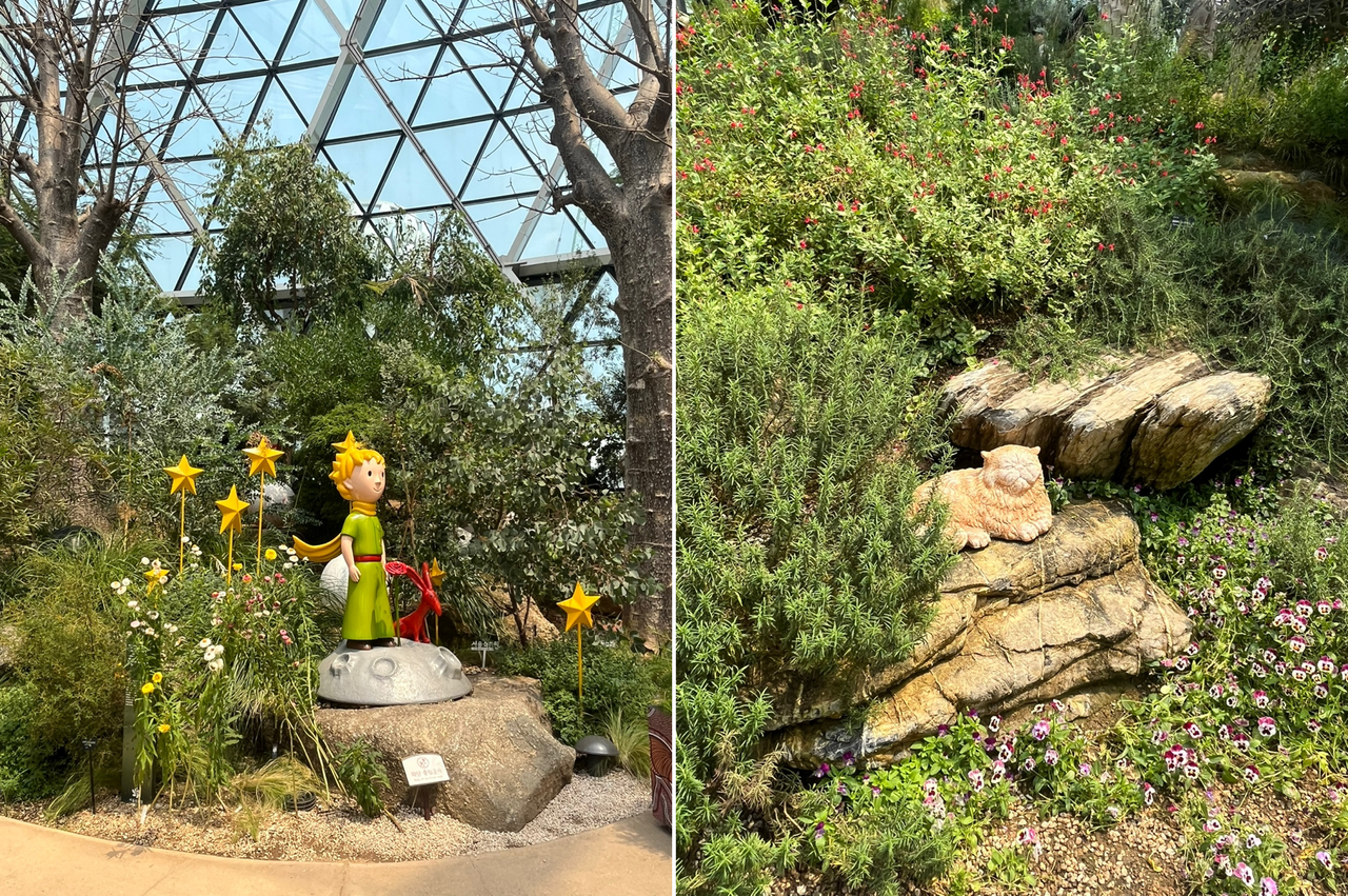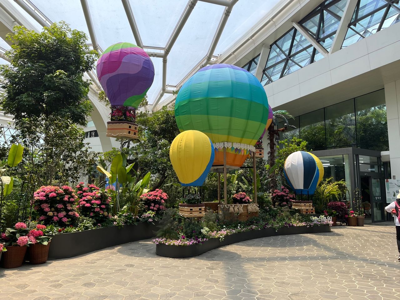 온실 내부로 들어가면 먼저 열기구가 반겨줍니다. 식물들과 함께 색색의 열기구 모형이 있는데, 열기구 사이의 공간으로 들어가면 마치 열기구를 탄 것 같은 그림으로 사진을 찍을 수 있습니다. 주요 포토존으로 사람들이 사진을 많이 찍을 것 같네요!