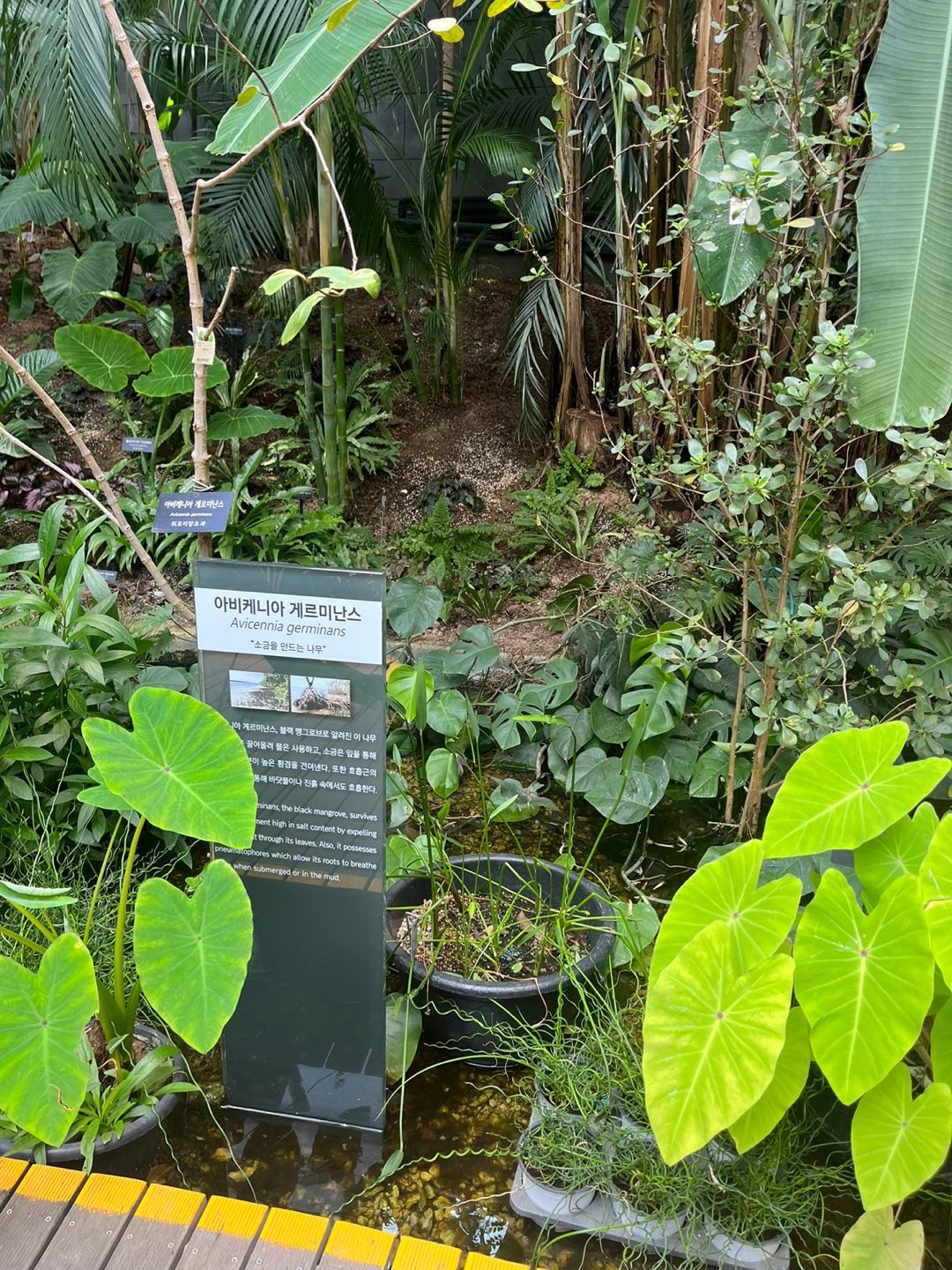 열대관에는 수많은 신기한 식물이 있었지만, 제가 가장 신기했던 것은 바로 소금을 만드는 나무 ‘아비케니아 게르미난스’였습니다. 여러분은 소금을 만드는 나무가 있다는 사실 알고 계셨나요? 블랙 맹그로브로 알려진 이 나무는 바닷물을 끌어올려 물은 사용하고 소금은 잎을 통해 배출하여 염분이 높은 환경을 견뎌낸다고 합니다. 자연의 신비란 정말 놀랍습니다!