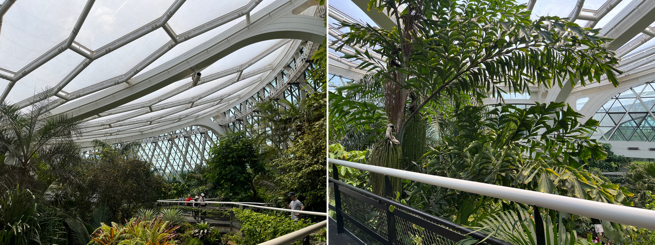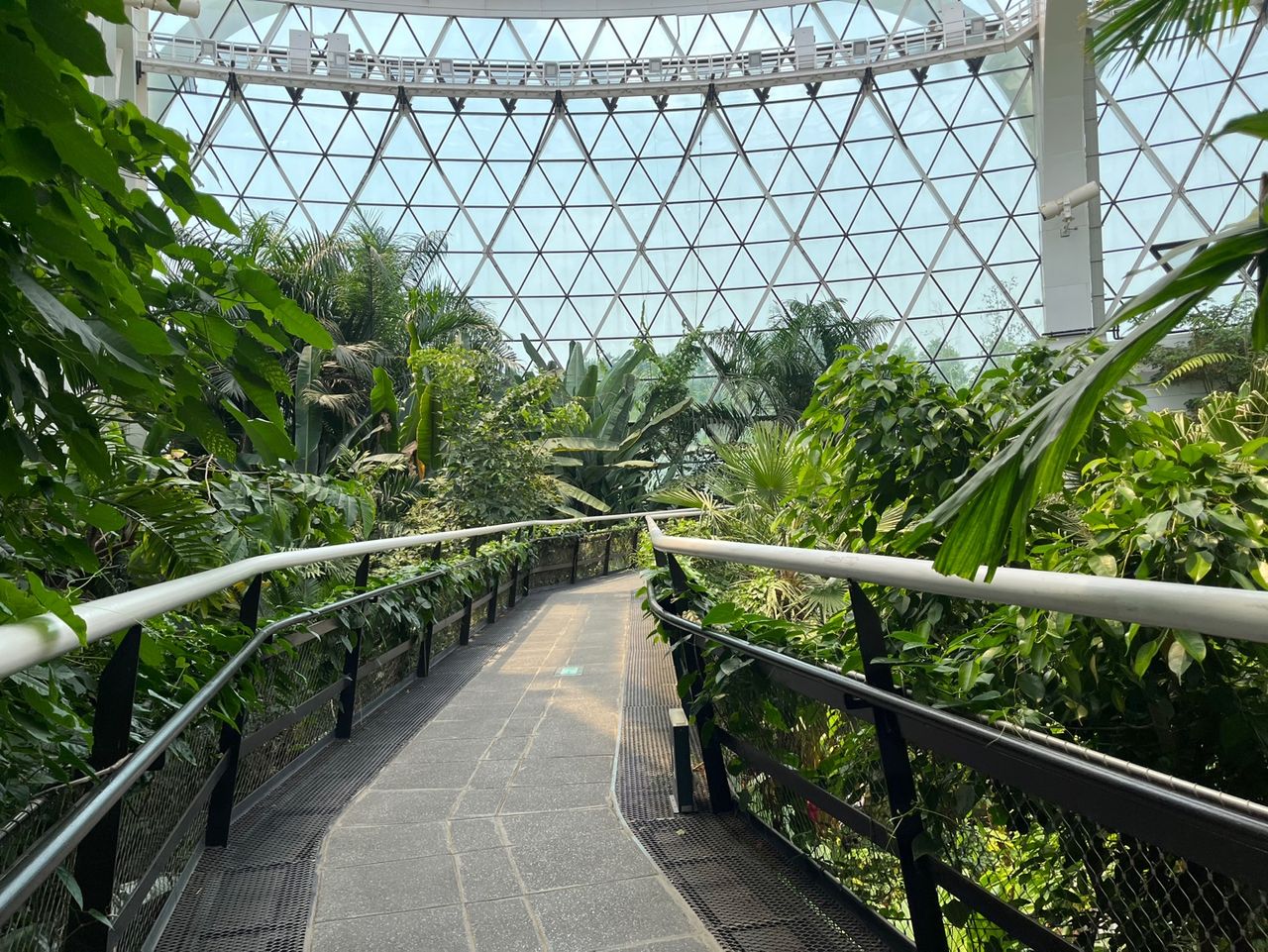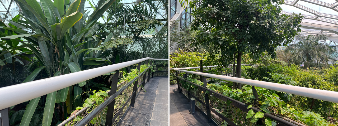 스카이워크를 걸으며 온실의 위쪽에서 높이 자란 식물들까지 더 가까이에서 보고 느낄 수 있습니다.