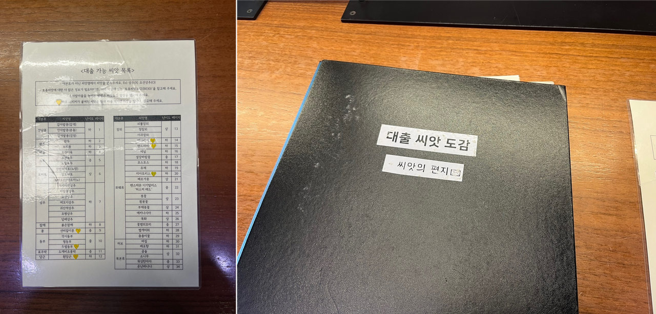 테이블 위에 대출 가능 씨앗 목록과 대출 씨앗 도감이 있습니다. 대출 씨앗 목록을 살펴보고, 대출하고 싶은 씨앗을 키우는 법을 씨앗 도감에서 찾아 읽어본 후 씨앗을 대출하면 됩니다. 저는 현재 파종 적기의 씨앗 중 난이도가 낮은 ‘흰당근’을 선택했습니다. 한번 열심히 키워보겠습니다!