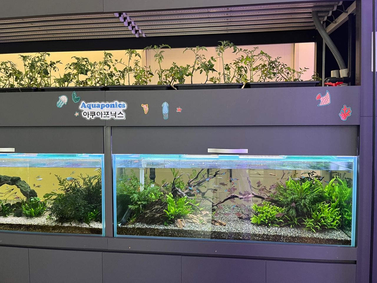 그 옆에는 아쿠아포닉스*가 위치하고 있습니다. 아쿠아포닉스는 영양분이 포함된 물에서 식물을 재배한다는 점에서 수경재배에 포함되지만, 가장 큰 특징은 식물에 필요한 영양분을 물고기로부터 공급받을 수 있다는 것입니다. 실제로 식물과 함께 물고기가 있었습니다.