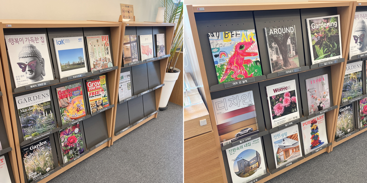 검은색 서가에는 외국어로 된 식물 관련 서적들이 있었습니다. 식물 전문 도서관은 국내 도서 8,471권, 국외 도서 2,552권을 보유하고 있는데요, 다양한 나라에서 출판된 식물 관련 도서를 만나볼 수 있다는 것이 큰 매력인 것 같습니다.