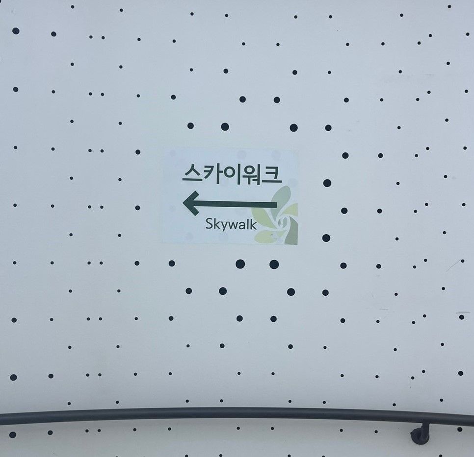 바닥의 화살표를 따라서 엘리베이터 혹은 계단을 이용하여 한 층 위로 올라간 후, 이렇게 하얀색의 신비로운 공간을 지나면 스카이워크가 등장합니다.