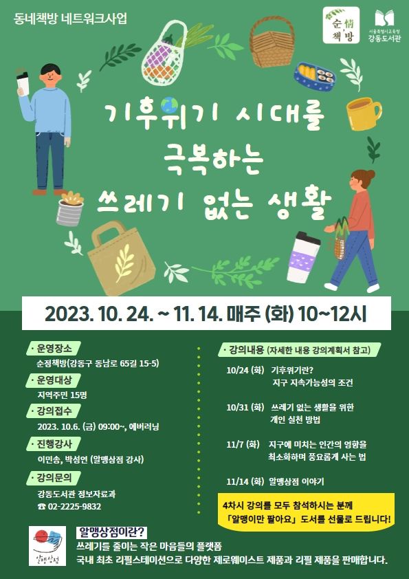 한편, ESG는 최근 여러 도서관들이 주목하고 있는 이슈다. 먼저 서울 강동도서관은 ESG와 환경에 관심이 많은 이용자들을 대상으로 다양한 문화 프로그램을 진행해왔다. 10~11월에는 ‘기후위기 시대를 극복하는 쓰레기 없는 생활’을 주제로 한 4회의 강좌를 열어, 지속가능한 지구생태를 위한 조건과 기후위기에 대해 이해하고 극복하는 방법을 개인적인 차원과 사회적인 차원에서 찾아봤다. 회차별 내용을 소개하면 다음과 같다.