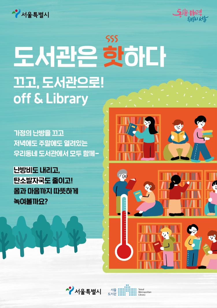 서울도서관이 가정 냉·난방비 부담을 해소하고 탄소 배출량의 감소를 위해 ‘도서관은 핫하다’ 캠페인을 진행 중이다. 2023년부터 2년째 겨울철에 시행하고 있는 이 캠페인은 여름에는 ‘도서관은 쿨하다’로 변신한다. 서울도서관에서 왜 계절마다 “끄고, 도서관으로! (Off & Library)”를 이야기하는지 들어보자.
