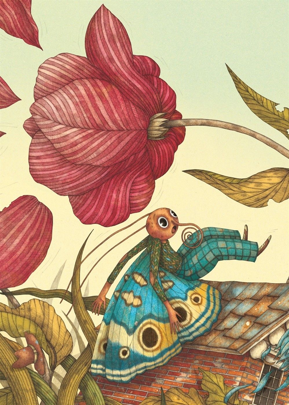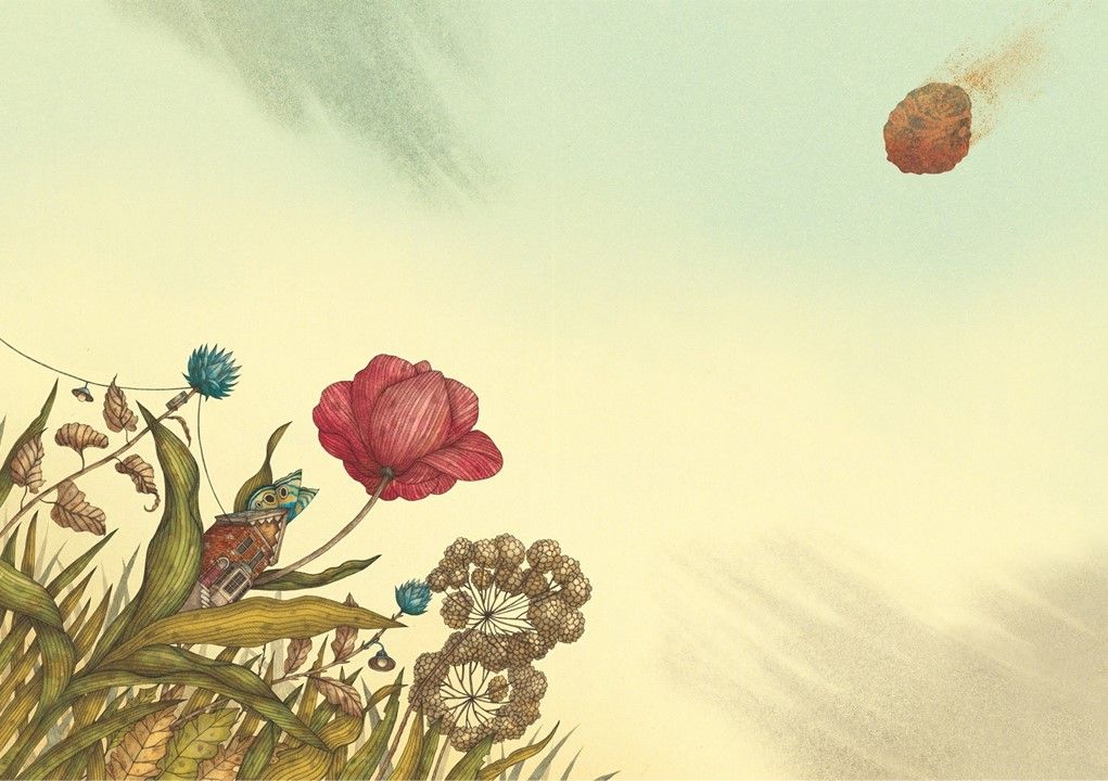 그림책은 표지를 넘기는 순간 시작된다. 면지 왼쪽 페이지 아래를 보면 45도로 기울어진 마을을 향해 오른쪽 위에서 속도감을 가진 무언가가 떨어지고 있다. 이어 그것이 점점 다가와 땅에 떨어지자 그 충격은 나비가 뒤로 넘어질 정도로, 꽃잎이 떨어져 나갈 정도로 크다. 커다란 꽃잎과 풀의 흔들림, 나비의 표정으로 그 충격을 짐작할 수 있다. 살다 보면 우리가 직면하는 문제들 중에는 어떤 예고나 전조도 없이 ‘쿵’ 하고 맞닥뜨리게 되는 경우도 많다. 그런 상황에서는 당황스럽고 불안한 마음을 감출 수가 없다. 나비들이 살아가는 이 마을도 어느 날 하늘에서 떨어진 엄청나게 커다란 무언가로 인해 주민들이 모두 혼란에 빠진다.