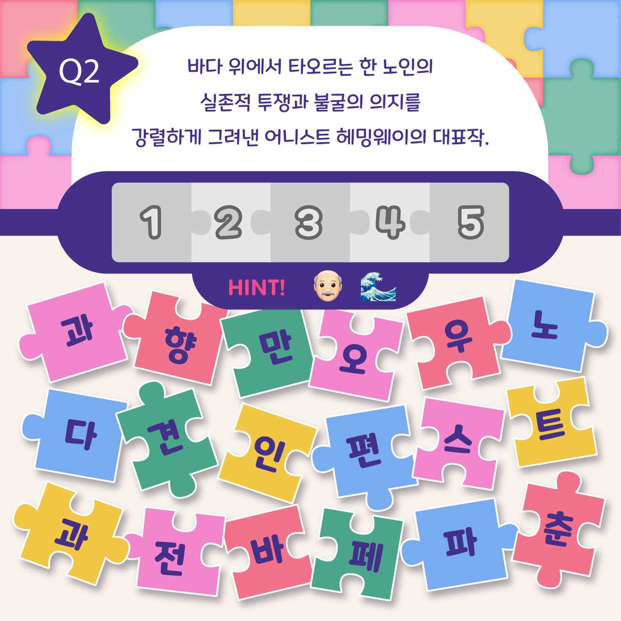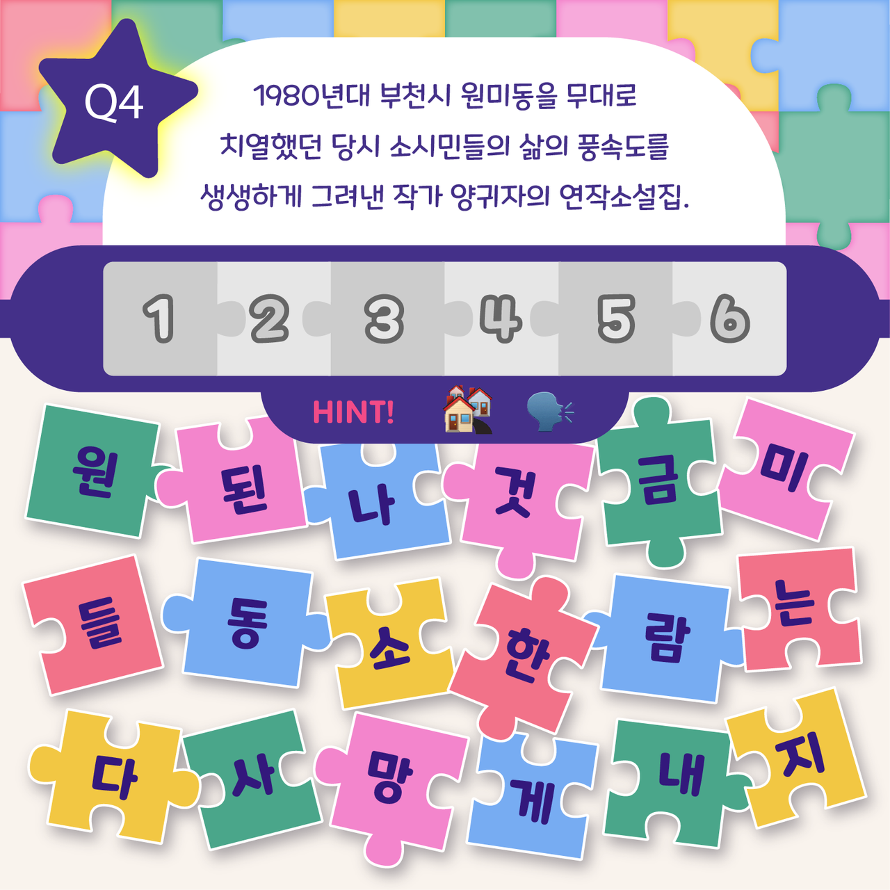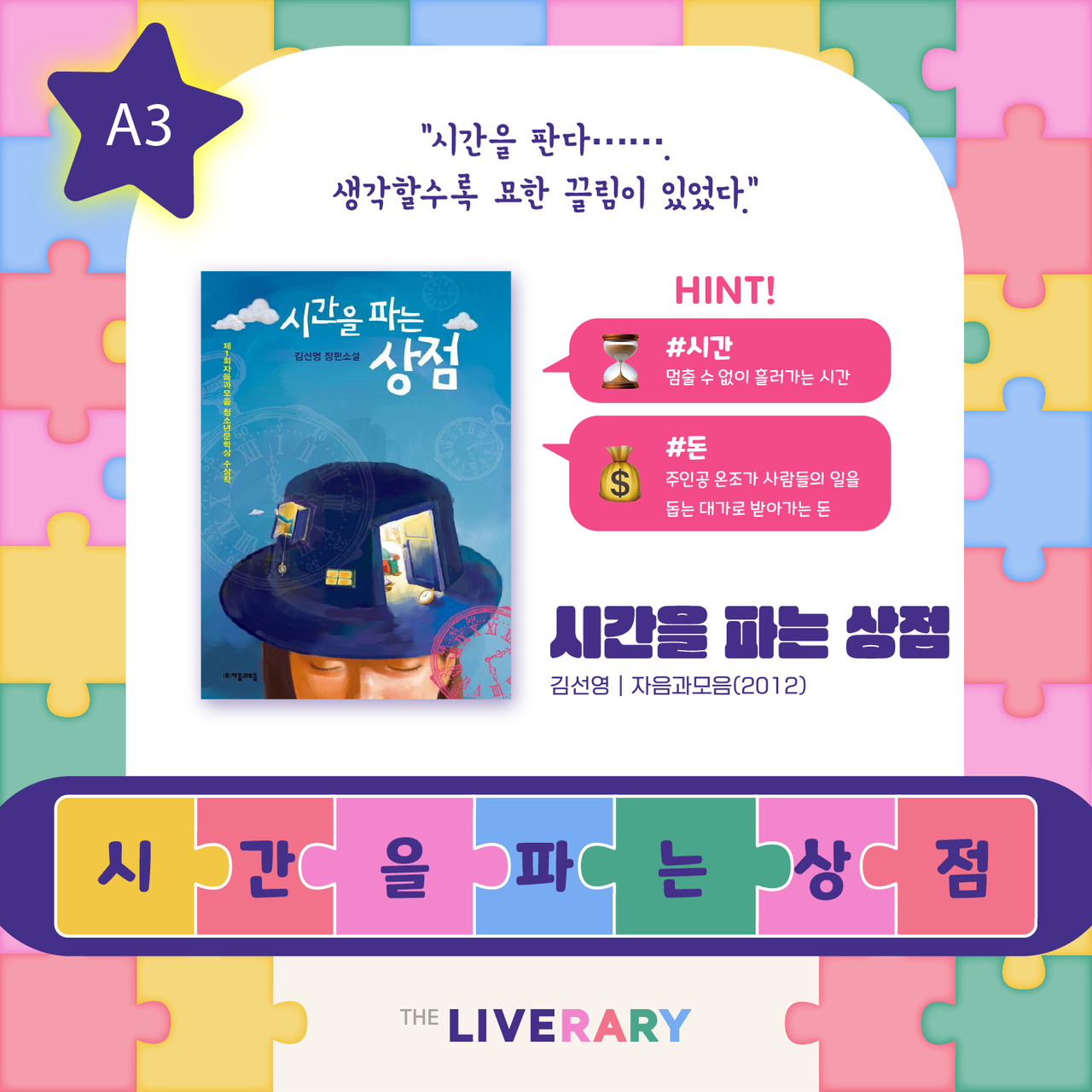 책 속 한줄 맞추기는 도서 속 문장의 배열을 맞춰보는 문장 퀴즈 콘텐츠입니다.시시각각 복잡다난하게 변화하는 세상 속에서 잠시 숨 고를 수 있는 시간이 되길 바랍니다. -정답을 확인해볼까요? .........