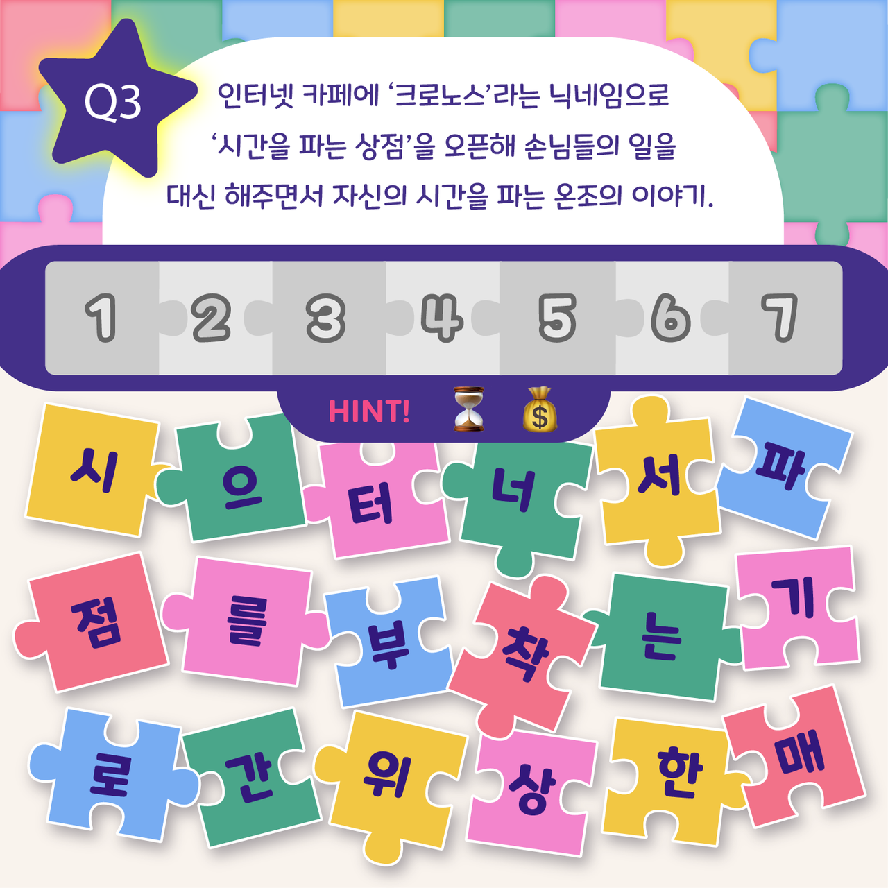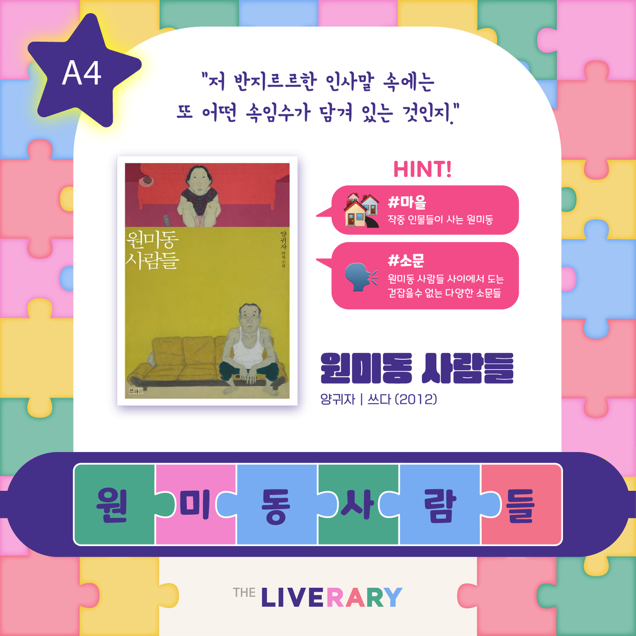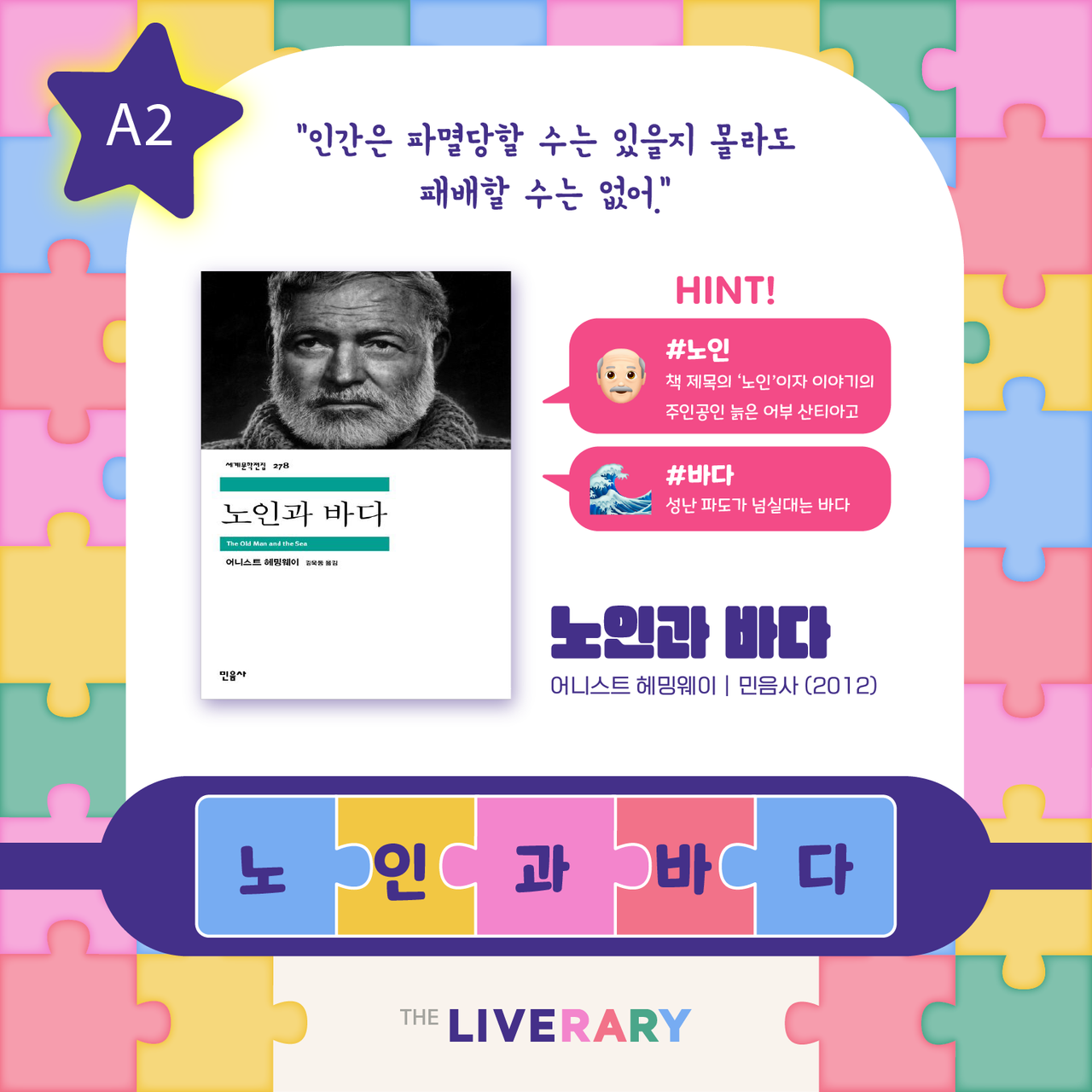 책 속 한줄 맞추기는 도서 속 문장의 배열을 맞춰보는 문장 퀴즈 콘텐츠입니다.시시각각 복잡다난하게 변화하는 세상 속에서 잠시 숨 고를 수 있는 시간이 되길 바랍니다. -정답을 확인해볼까요? .........