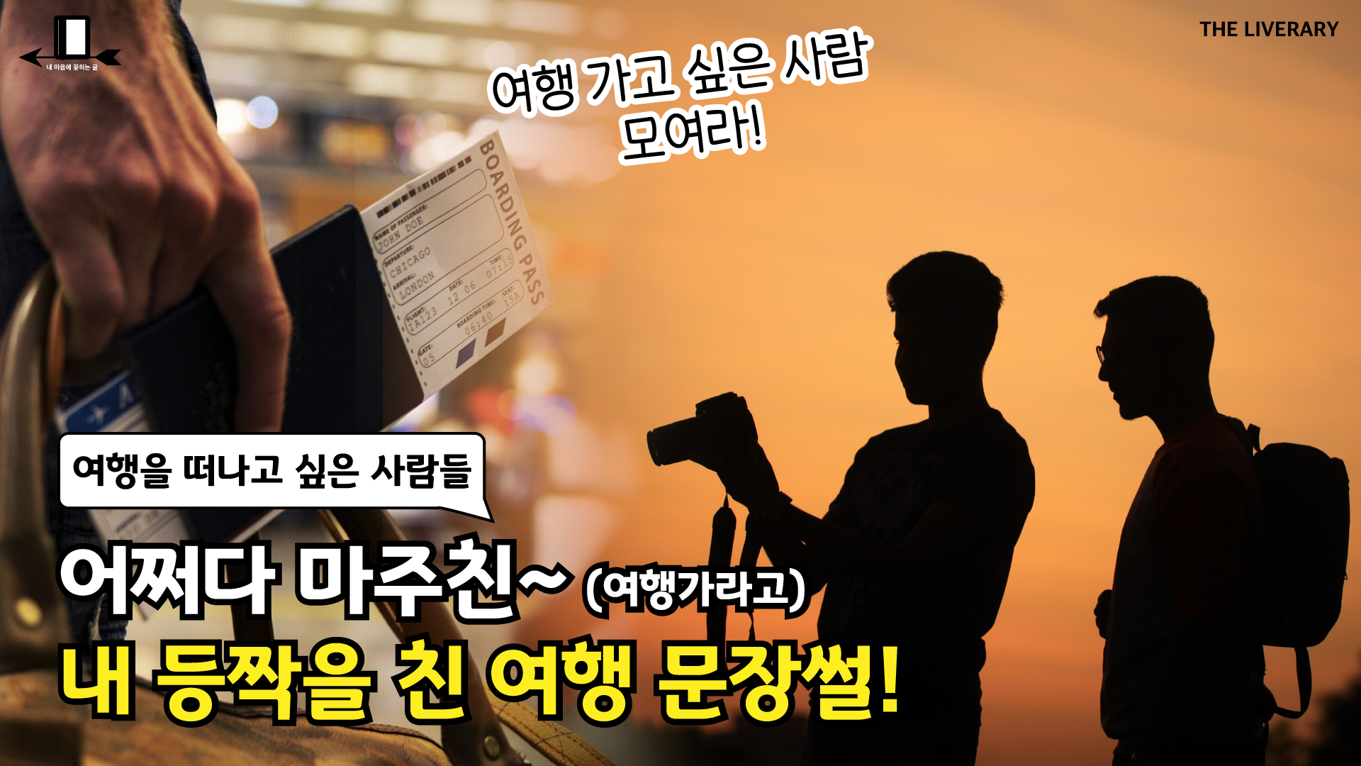 마음에 꽂히는 글을 소개하는 코너 ‘글꽂’더라이브러리 기획팀이 선정한 도서와 함께마음속에 꽂히는 문장을 찾아보세요!8월 호, ‘지금 당장 떠나고 싶은 당신에게!’ 속 꽂히는 문장을 찾으러 고고!