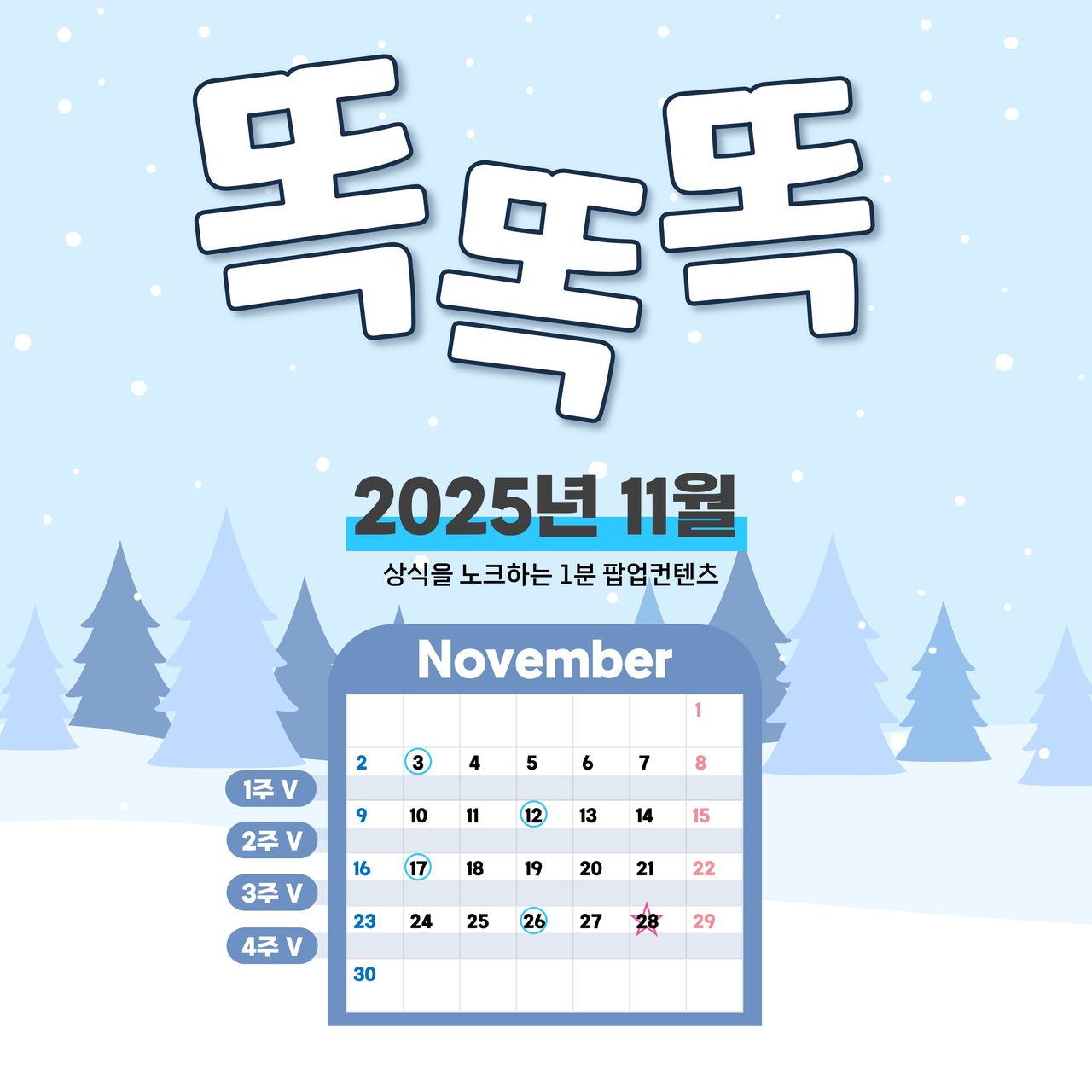 “똑똑똑” 상식을 노크하는 1분, 똑똑똑은요매주 딱 하루만 만날 수 있는 POP콘텐츠로 팝콘처럼 ‘팝’ 터지는 맛있는 1분을 상상하고 만들었어요.11월에는 ‘예술’ 분야에서 콘텐츠를 구성해보았습니다.매주 딱 하루…! 노크했던 똑똑똑 콘텐츠를 모아서 볼까요? 11월 1주_명언 편
